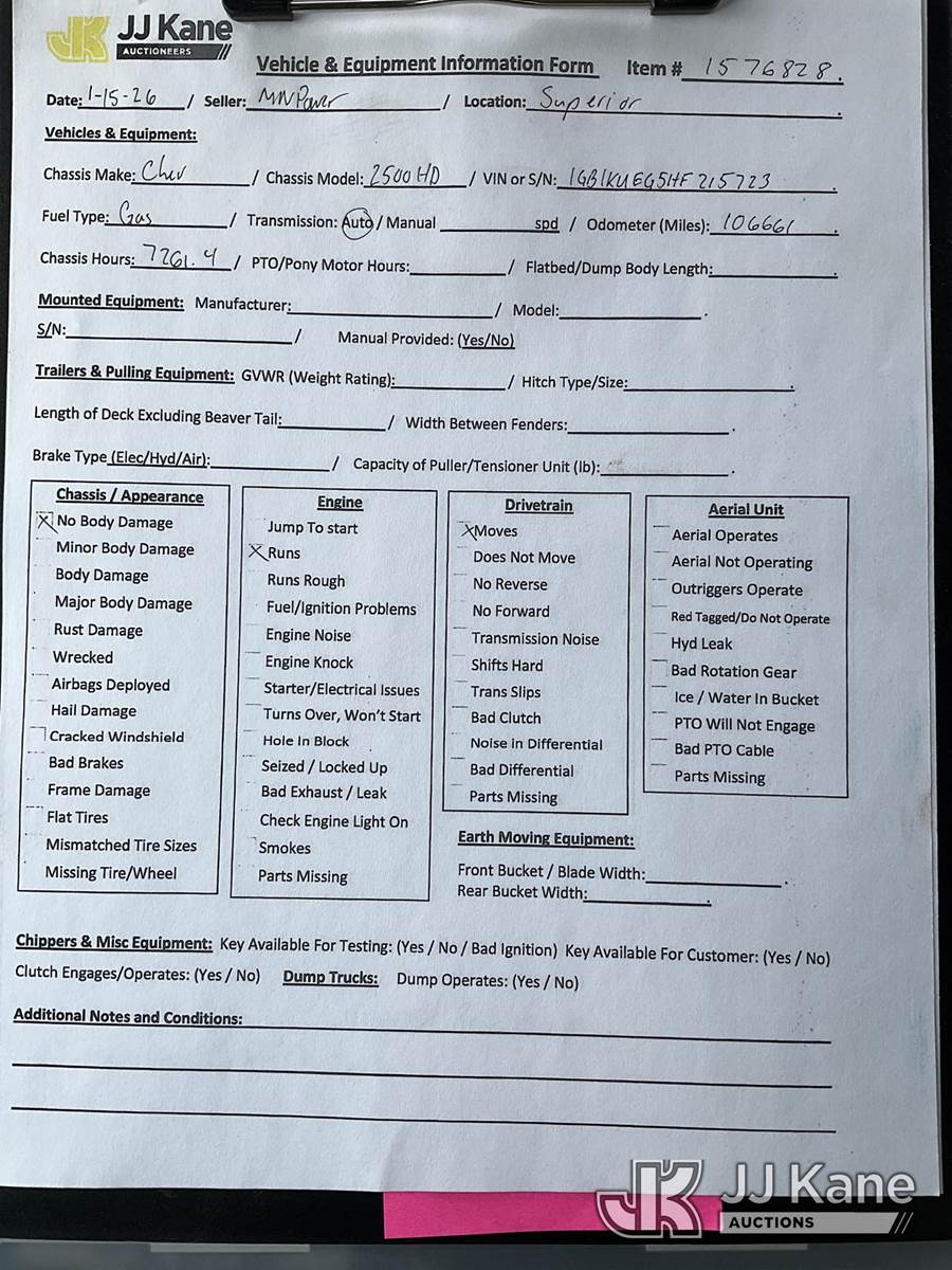 2017 Chevrolet Silverado 2500HD Crew-Cab Service Truck, 8-cyl gas, Auto, 4wd, A/C, (106,661 miles) (Runs & Moves) This is a Titled Item NOTE: This unit is being sold AS IS/WHERE IS via Timed Auction and is located in Superior, WI. For specific technical information or questions about this item, contact Ben Boucher at (612) 616-2798. For load-out and pick information, reference the hauler sheet sent out after purchase. These items are used and may contain defects that are not immediately detectable. Text descriptions and photos given are meant to be used as a guide only. The conditions are provided by the consignor. The Buyer is responsible for inspecting the item before bidding. Purchaser acknowledges ALL lots must be removed within 10 business days of the Auction, or a storage fee may be incurred. All information provided is believed to be correct but no warranty as such is either intended or implied. All items are sold AS IS - WHERE IS AND WITH ALL FAULTS AND DEFECTS THEREIN. (Buyer is responsible for removal. Assistance by consignor or JJ Kane Auctions is not assured.)