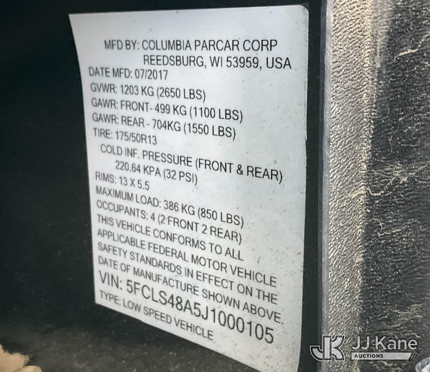 2017 Columbia Utility Cart, s/n 5FCLS48A5J1000105, Battery electric, (3,587 miles) (Runs & Moves) This is a Titled Item NOTE: This unit is being sold AS IS/WHERE IS via Timed Auction and is located in Jurupa Valley, CA. Inspection & preview days for this unit are the 2 business days prior to the first day of items closing for this auction, item is located at 4510 Muth Way Jurupa Valley, CA 92509 and hours of operations are 8a-4p. For pre-sale questions, please contact please contact Office Staff @ (310) 353-7140. Dealer License Number 45696. (Buyer is responsible for removal. Assistance by consignor or JJ Kane Auctions is not assured.)