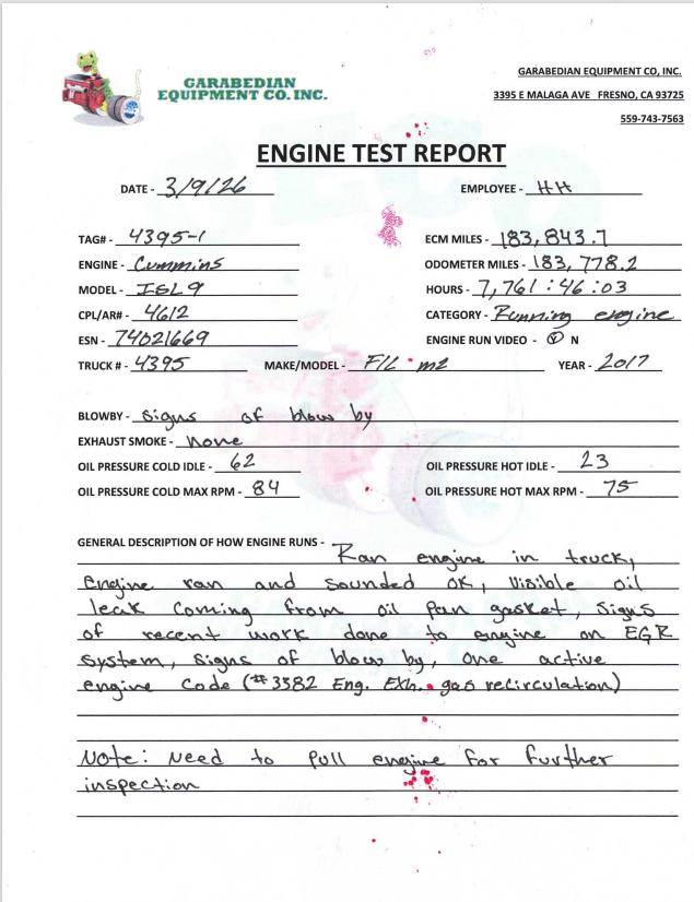 Cummins ISL9 EPA13, 350 HP, CPL-4612, CM2350 L1010, S/N- 74021669, 183,778.2 ODO Miles, 6896.9 ODO Hours, 183,843.7 ECM Miles, 7761.40 ECM Hours. (Please See Video Of Engine Running And Test Report)