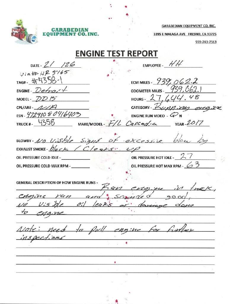 Detroit DD15 EPA10 GHG17, 455 HP, S/N- 472910S0416403, 939,062.1 ODO Miles, 939,062.2 ECM Miles, 27,644.95 Hours. (Please see video of engine running and test report)