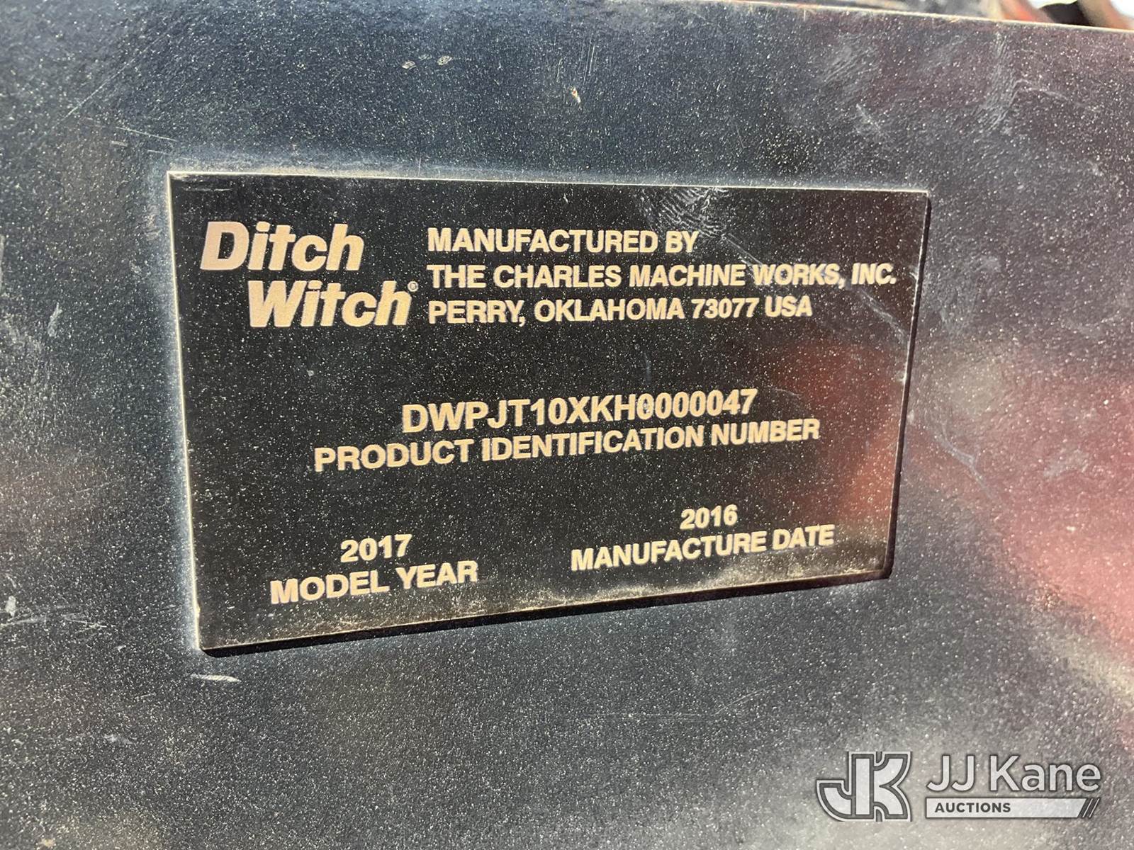 2017 Ditch Witch JT10 Directional Boring Machine, s/n DWPJT10XKH0000047, Deutz diesel, Hydraulic Drive, with ~ 88 ft drill steel, hyd staking, reamer, rubber tracks & riding console, (Runs, Moves & Operates) (Hyd Leak) (Seller States: Rotation Gear Box Needs Replaced, Worn Carriage Rollers Need Replaced.) (Reads 2,344 hours) NOTE: This unit is being sold AS IS/WHERE IS via Timed Auction and is located in Concord, NC. (Buyer is responsible for removal. Assistance by consignor or JJ Kane Auctions is not assured.)