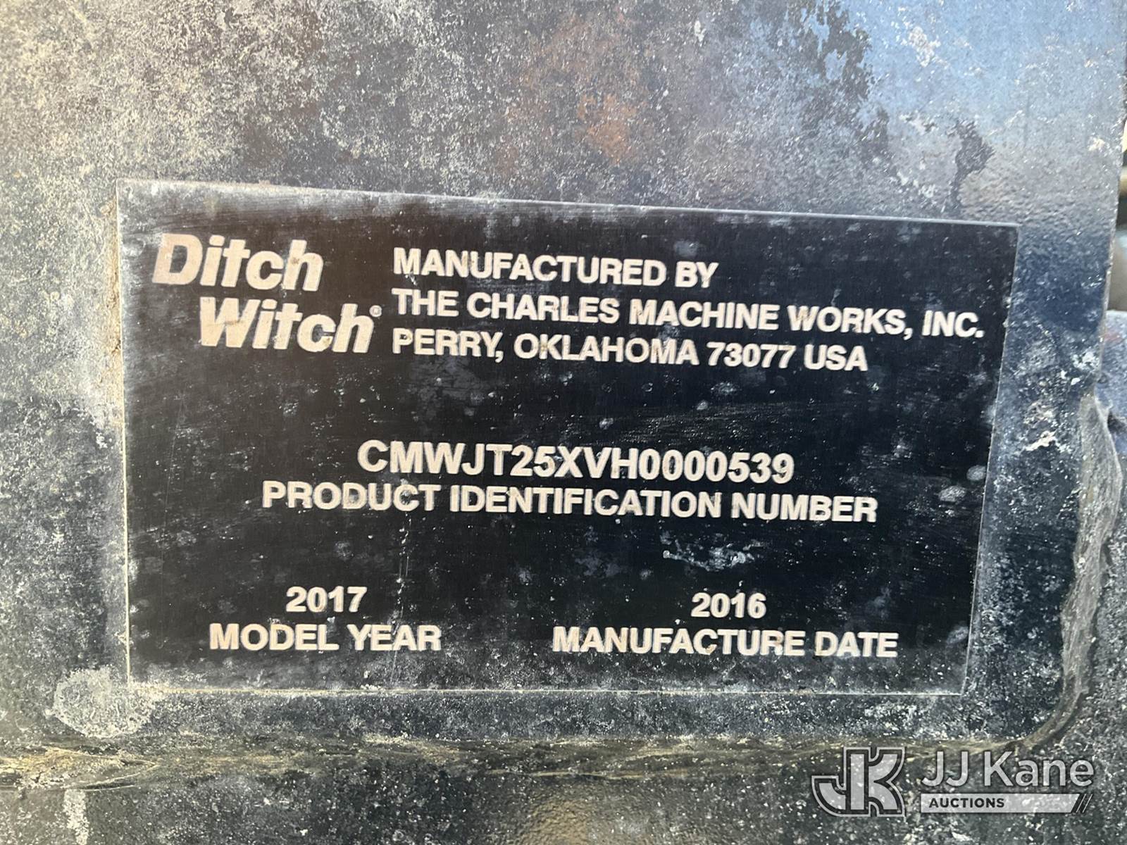 2017 Ditch Witch JT2020 Directional Boring Machine, s/n CMWJT25XVH0000539, 4-cyl, diesel, Hydraulic Driven, with rubber tracks, hyd hold downs, riding console, drill steel, wireless drive remote, (Runs & Operates)(Low Coolant Warning Light On) (Reads 1,835 hours) NOTE: This unit is being sold AS IS/WHERE IS via Timed Auction and is located in South Beloit, IL. Inspection & preview days for this unit are the 2 business days prior to the first day of items closing for this auction, item is located at 14354 Dearborn Ave South Beloit, IL and hours of operations are 8a-4p. For pre-sale questions, please contact Derek Eklund at (608) 904-0618 or (derek.eklund@jjkane.com). (Buyer is responsible for removal. Assistance by consignor or JJ Kane Auctions is not assured.)