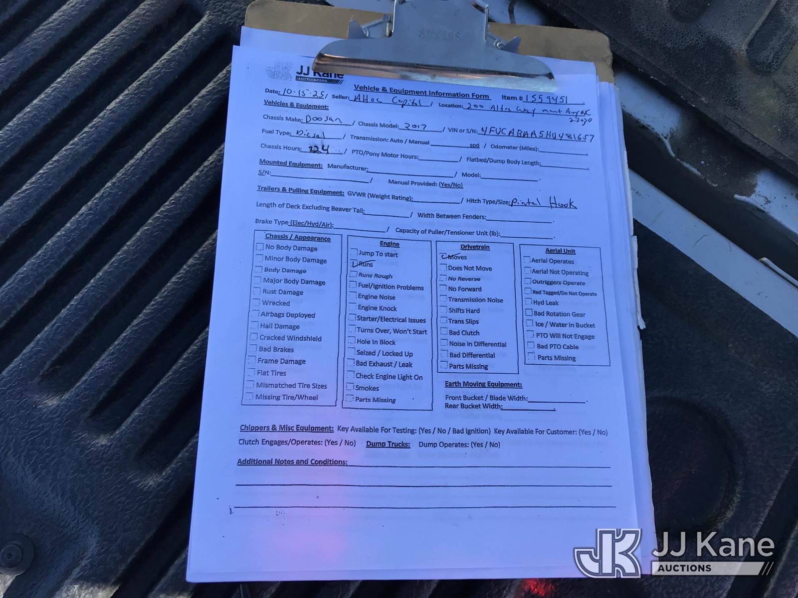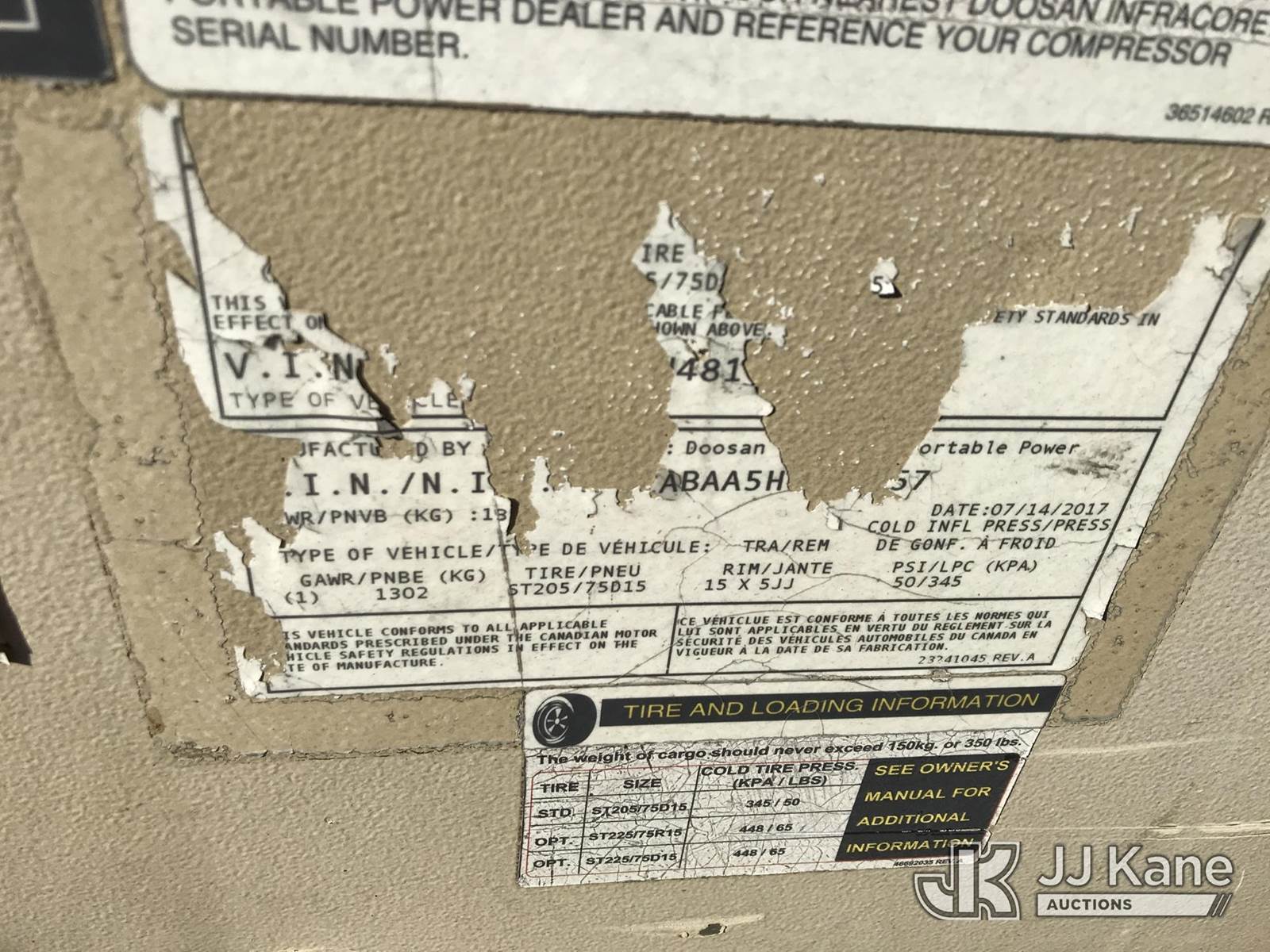 2017 DOOSAN Portable Air Compressor, diesel, (Runs) (Reads 224 hours) This is a Titled Item NOTE: This unit is being sold AS IS/WHERE IS via Timed Auction and is located in Mount Airy, NC. For more information & removal arrangements please contact Jim Carpenter @ 980-392-7918. (Buyer is responsible for removal. Assistance by consignor or JJ Kane Auctioneers is not assured.)