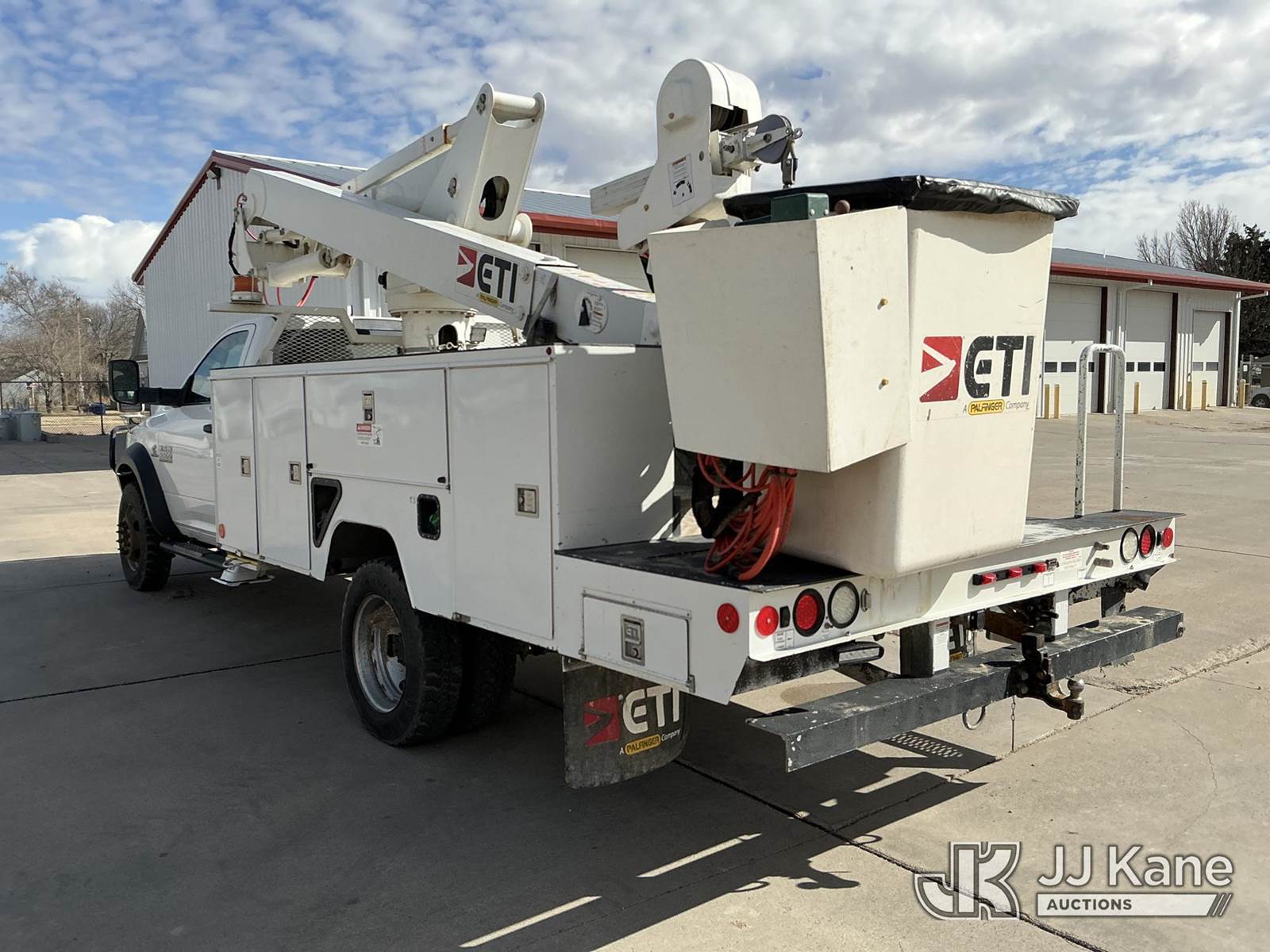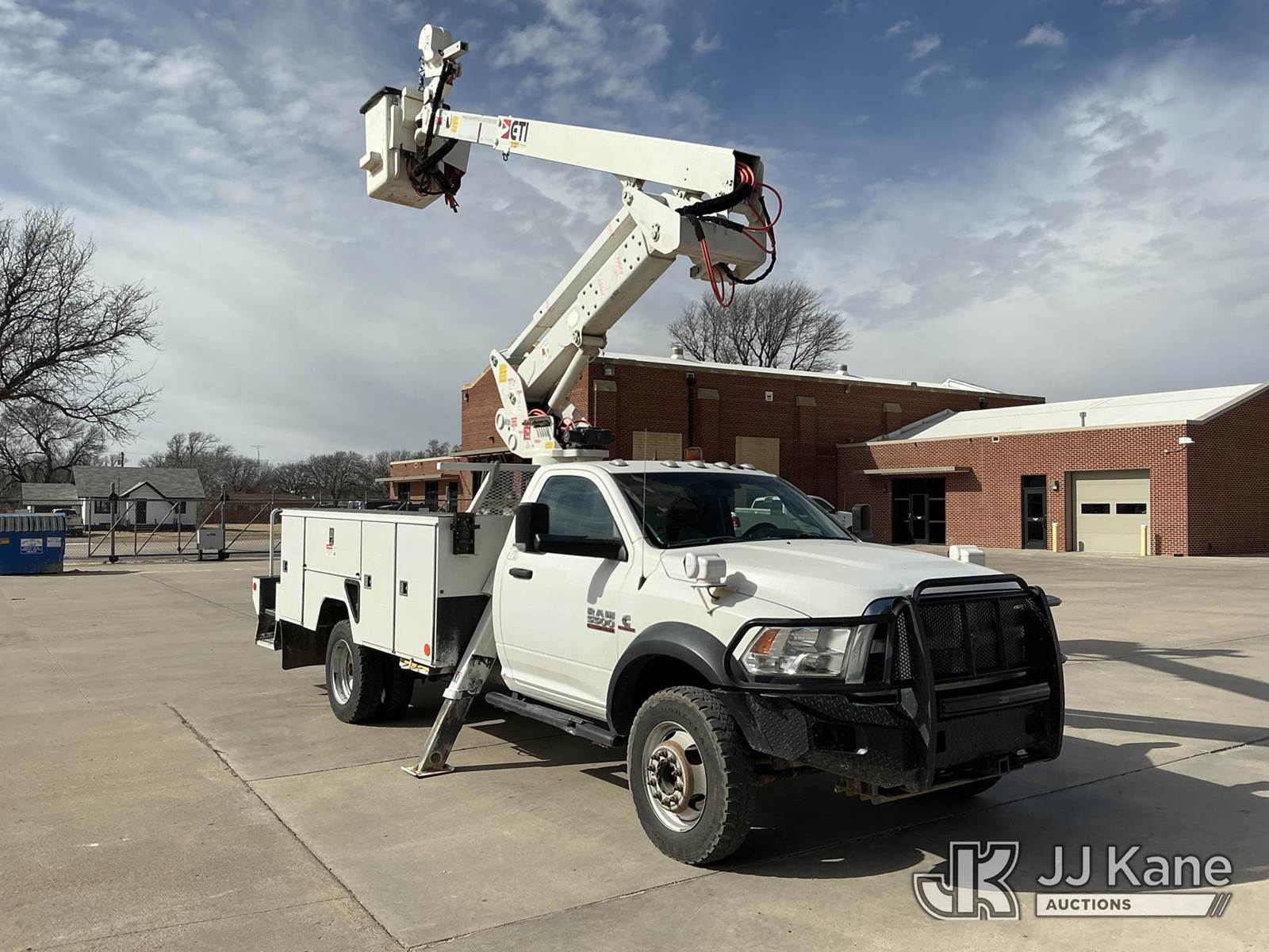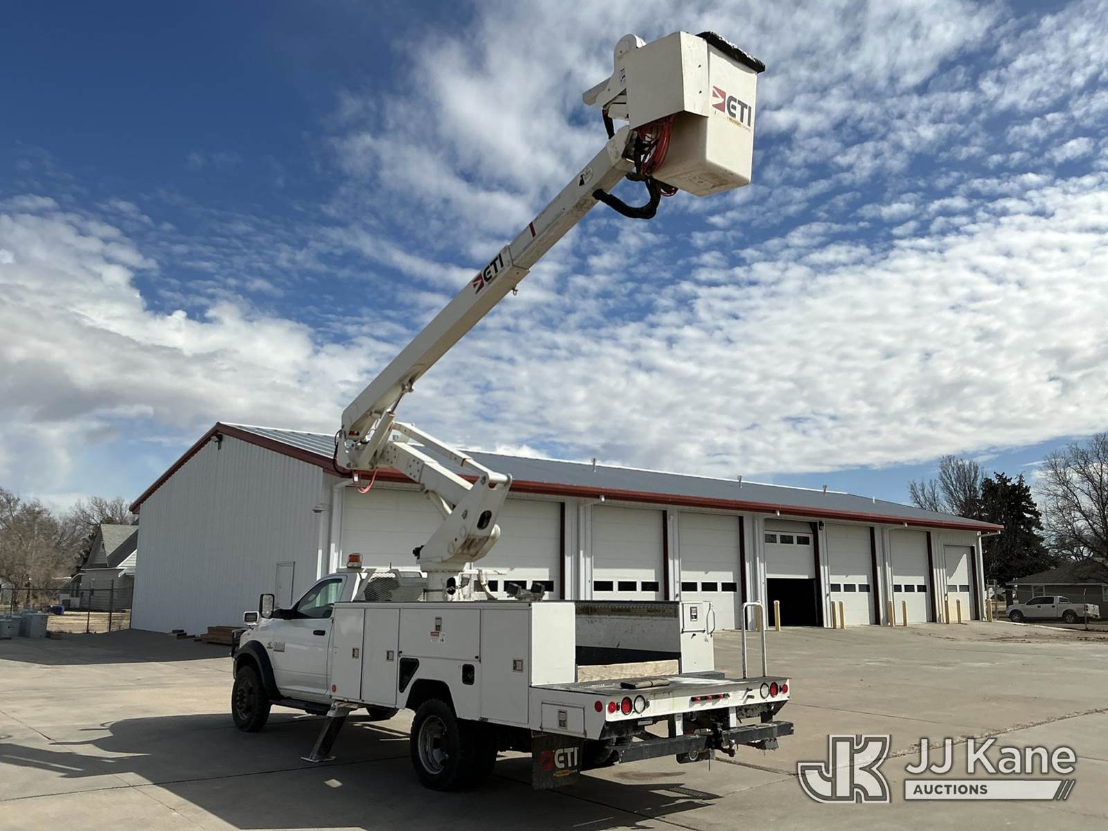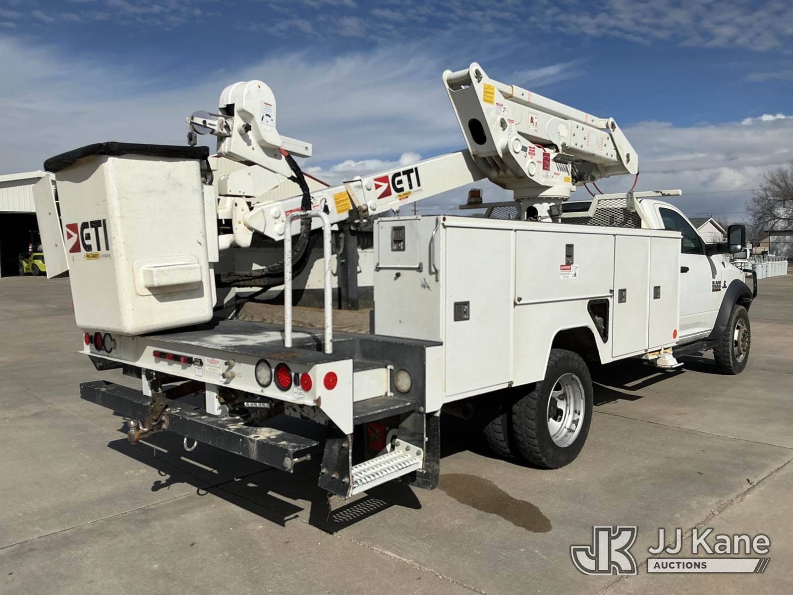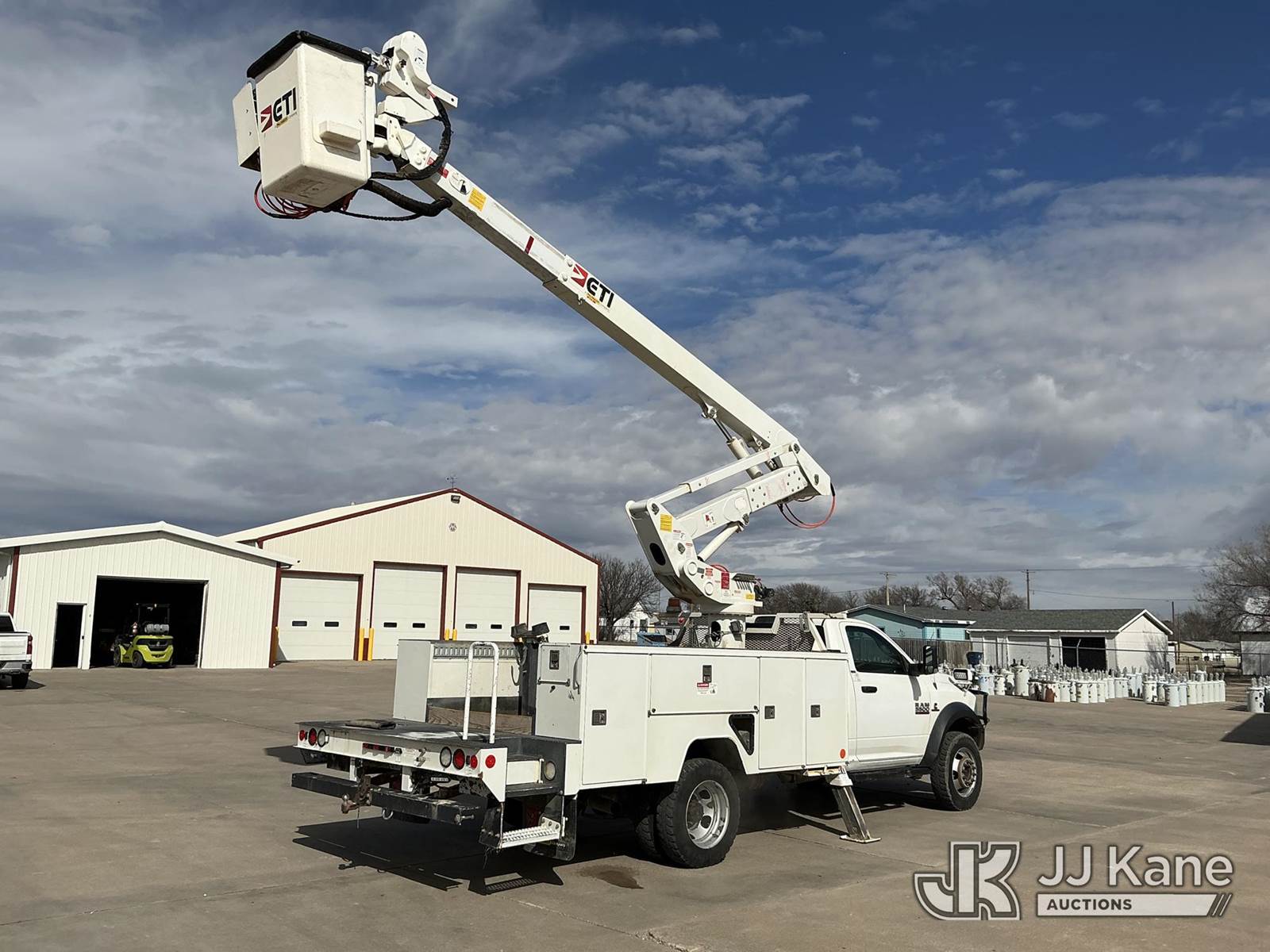 ETI ETCMH40-IH, 45 ft, Articulating & Telescopic Material Handling Bucket Truck s/n 0717CM014084, with single man bucket, mounted behind cab on 2017 RAM 5500 Service Truck, 6.7L diesel, 4wd, Auto, A/C, (143,908 miles) (Runs, Moves & Upper Operates) (Reads 4,977 hours) This is a Titled Item NOTE: This unit is being sold AS IS/WHERE IS via Timed Auction and is located in Dighton, KS. For more information, inspection appointment & removal arrangements contact Austin Scott @ 816-205-2291 (Missing manuals, See Auction Company for Manufacturers Information to obtain manuals) (Buyer is responsible for removal. Assistance by consignor or JJ Kane Auctions is not assured.)