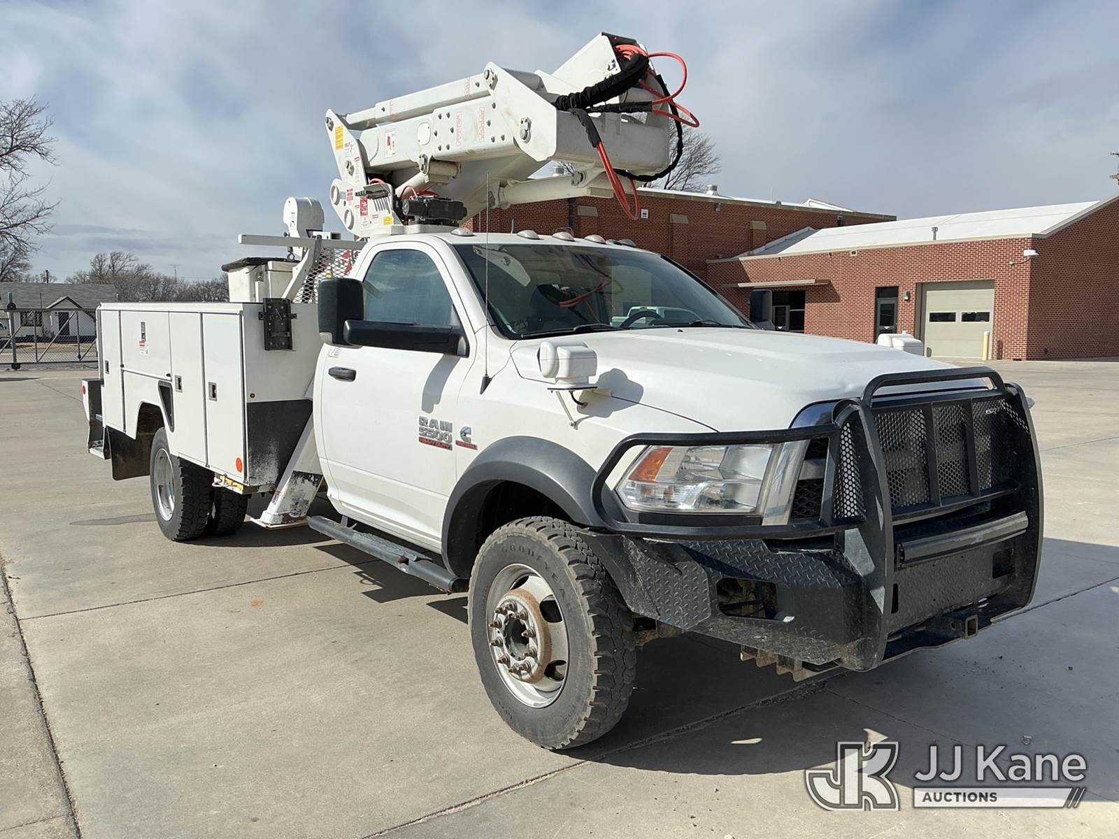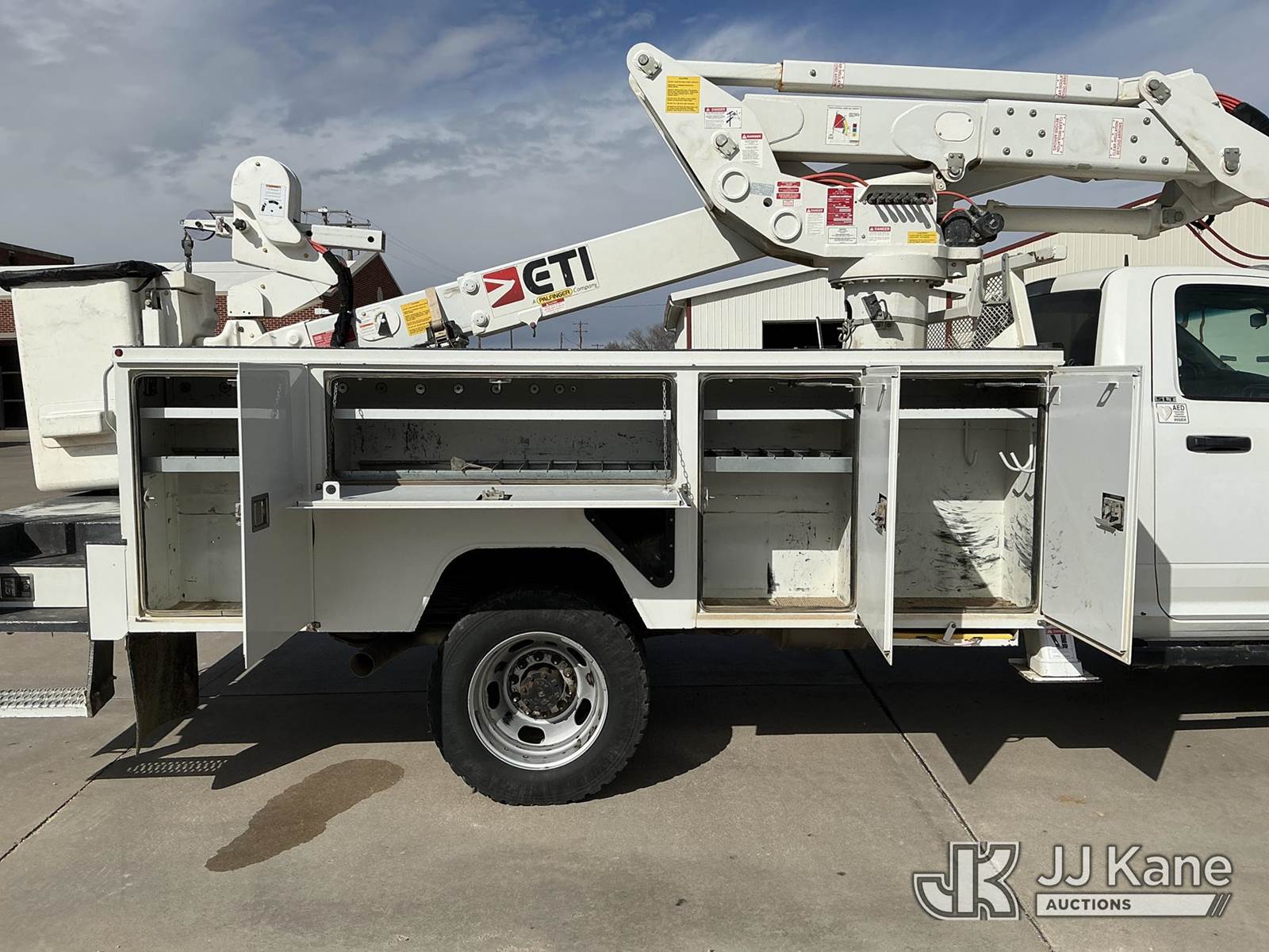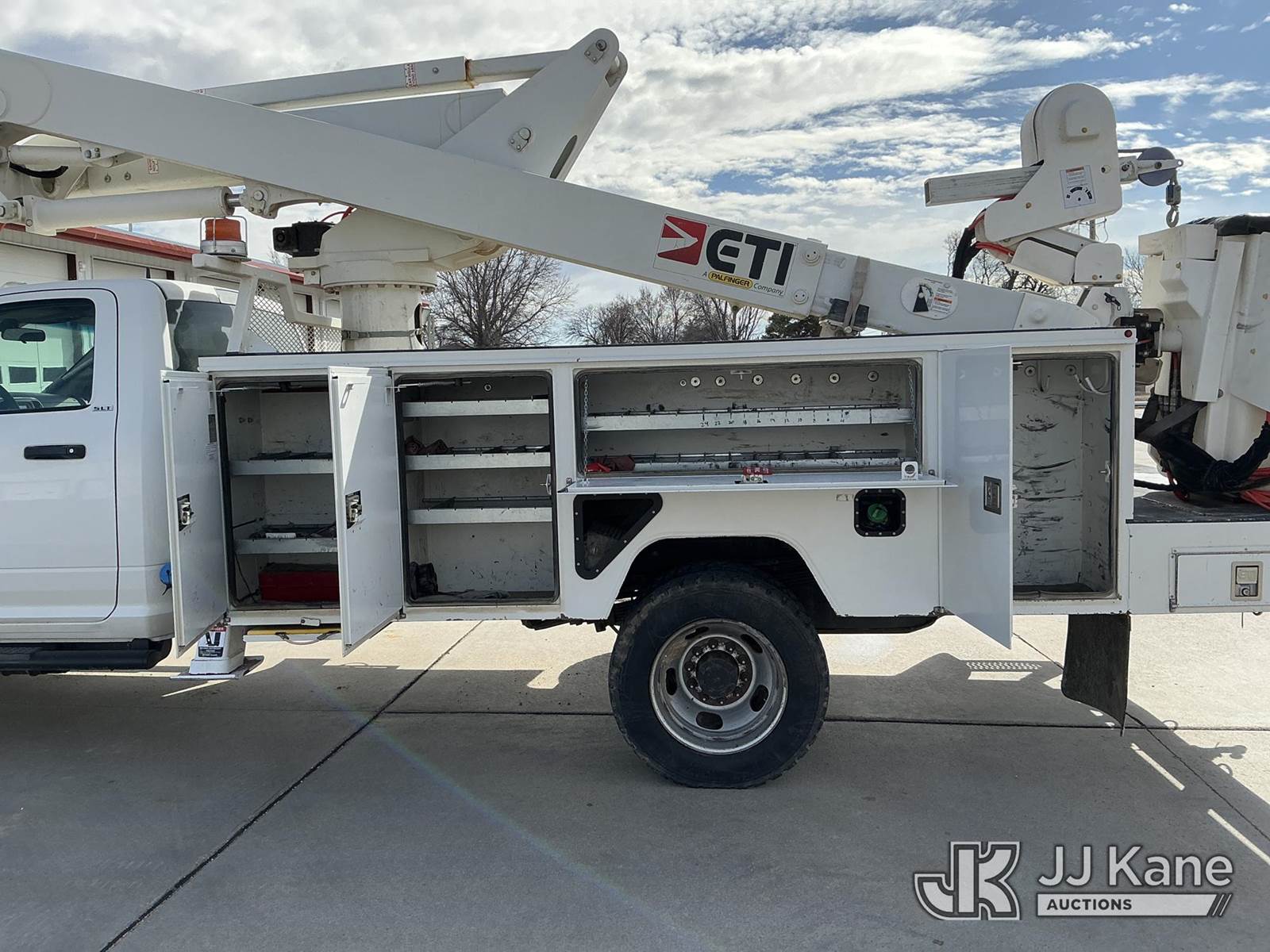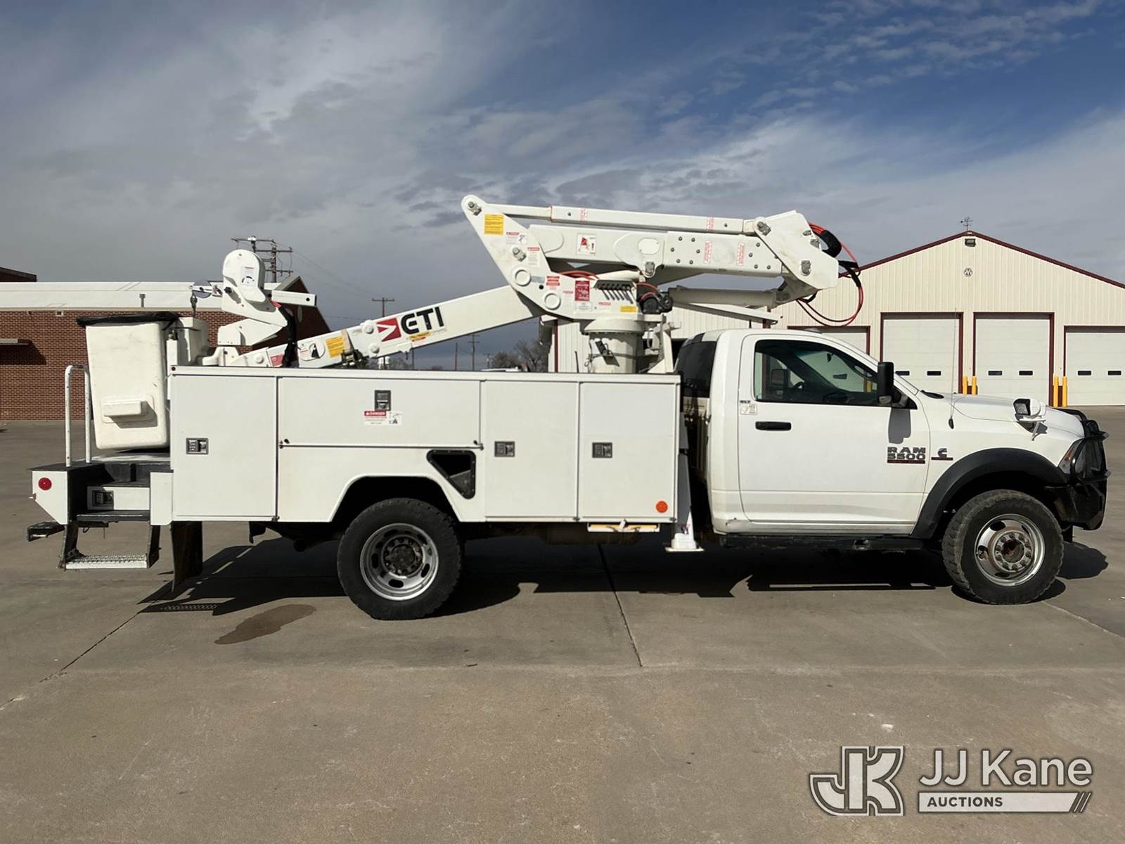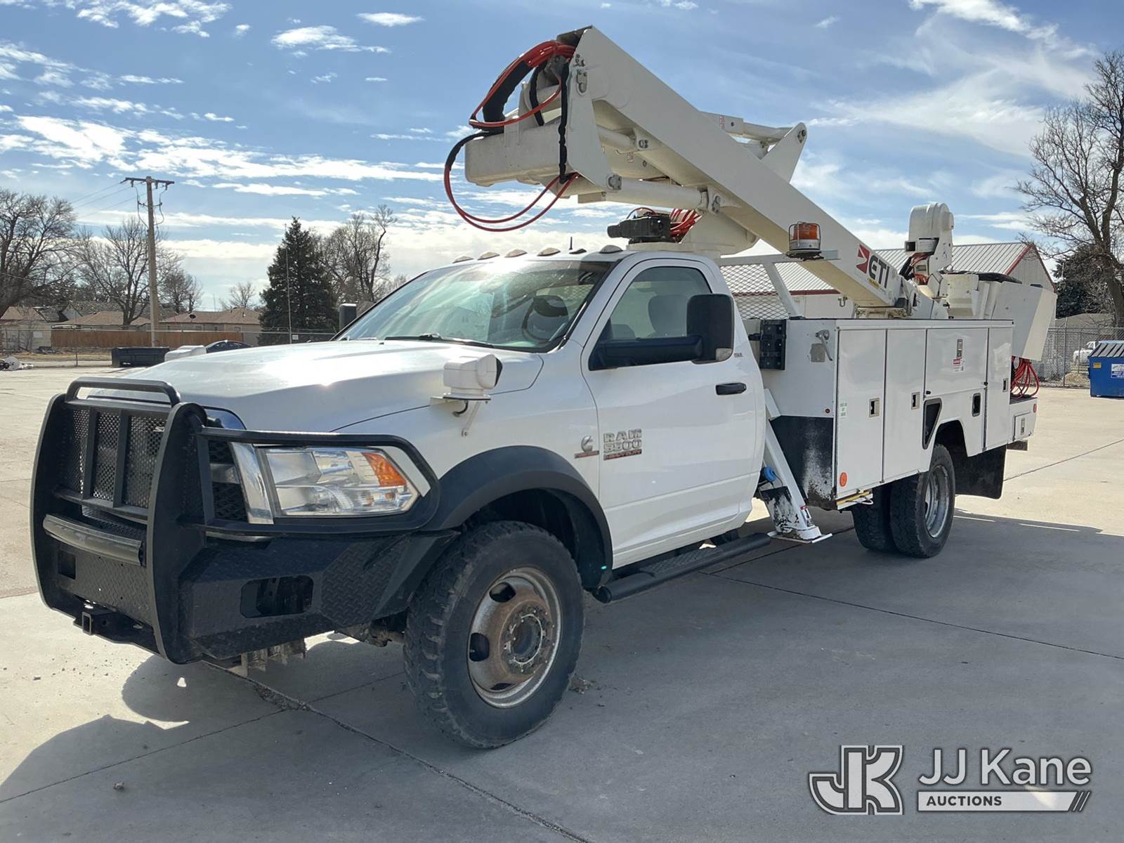 ETI ETCMH40-IH, 45 ft, Articulating & Telescopic Material Handling Bucket Truck s/n 0717CM014084, with single man bucket, mounted behind cab on 2017 RAM 5500 Service Truck, 6.7L diesel, 4wd, Auto, A/C, (143,908 miles) (Runs, Moves & Upper Operates) (Reads 4,977 hours) This is a Titled Item NOTE: This unit is being sold AS IS/WHERE IS via Timed Auction and is located in Dighton, KS. For more information, inspection appointment & removal arrangements contact Austin Scott @ 816-205-2291 (Missing manuals, See Auction Company for Manufacturers Information to obtain manuals) (Buyer is responsible for removal. Assistance by consignor or JJ Kane Auctions is not assured.)