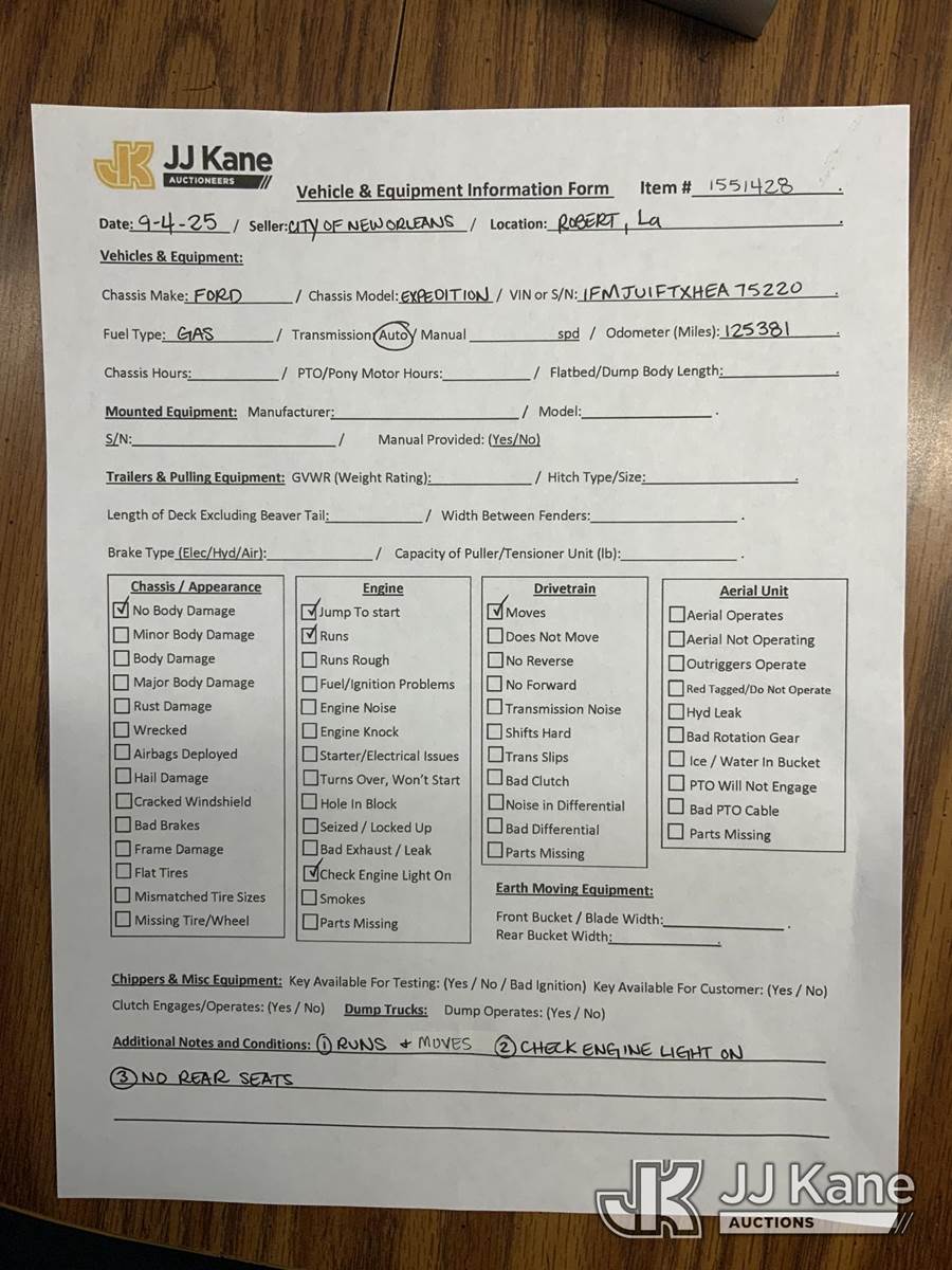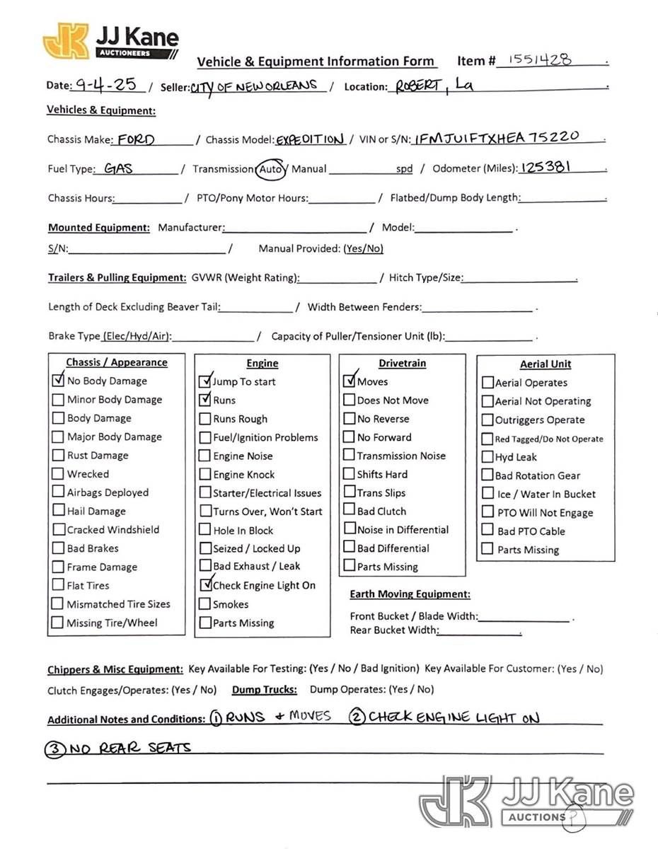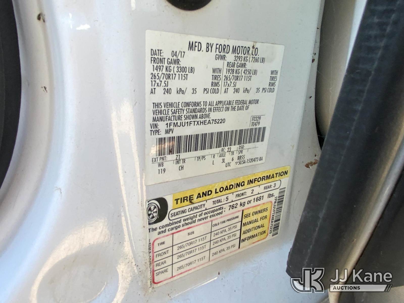 2017 Ford Expedition 4-Door Sport Utility Vehicle, 6-cyl gas, Auto, A/C, (125,381 miles) (Runs & Moves) (Jump To Start, Check Engine Light On, Rear Seats Removed) This is a Titled Item NOTE: This unit is being sold AS IS/WHERE IS via Timed Auction and is located in Robert, LA. Inspection & preview days for this unit are by appointment only; please contact us at contact@jjkane.com or 84-Go-JJKane for more details. License # LA AB-154 (Buyer is responsible for removal. Assistance by consignor or JJ Kane Auctions is not assured.)