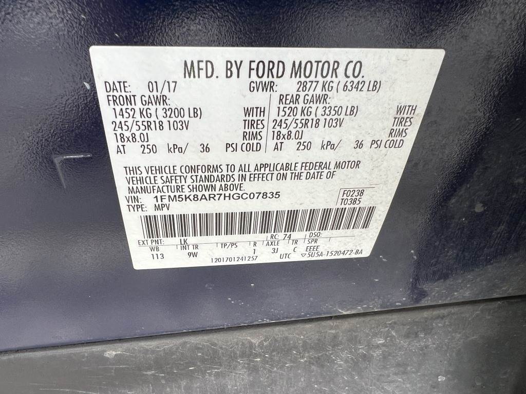 Location: Washougal WA ***City Government Surplus*** VIN: 1FM5K8AR7HGC07835 Engine: 3.7L 6cyl Gas Transmission: Automatic *No center console, no rear seats, no rear cargo floor* Spotlights, rearview camera, power windows, power mirrors, power locks, cruise control, 19,479 engine hours, A/C, AM/FM/CD/Bluetooth, 245/55R18 tires. Miles: 170,068