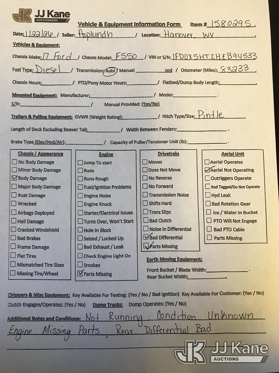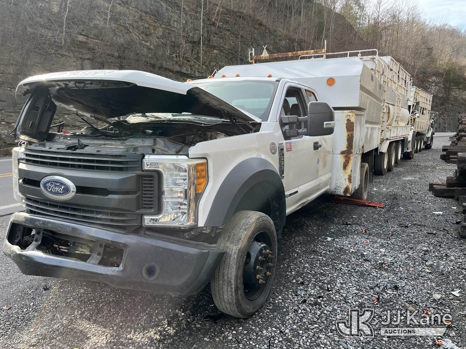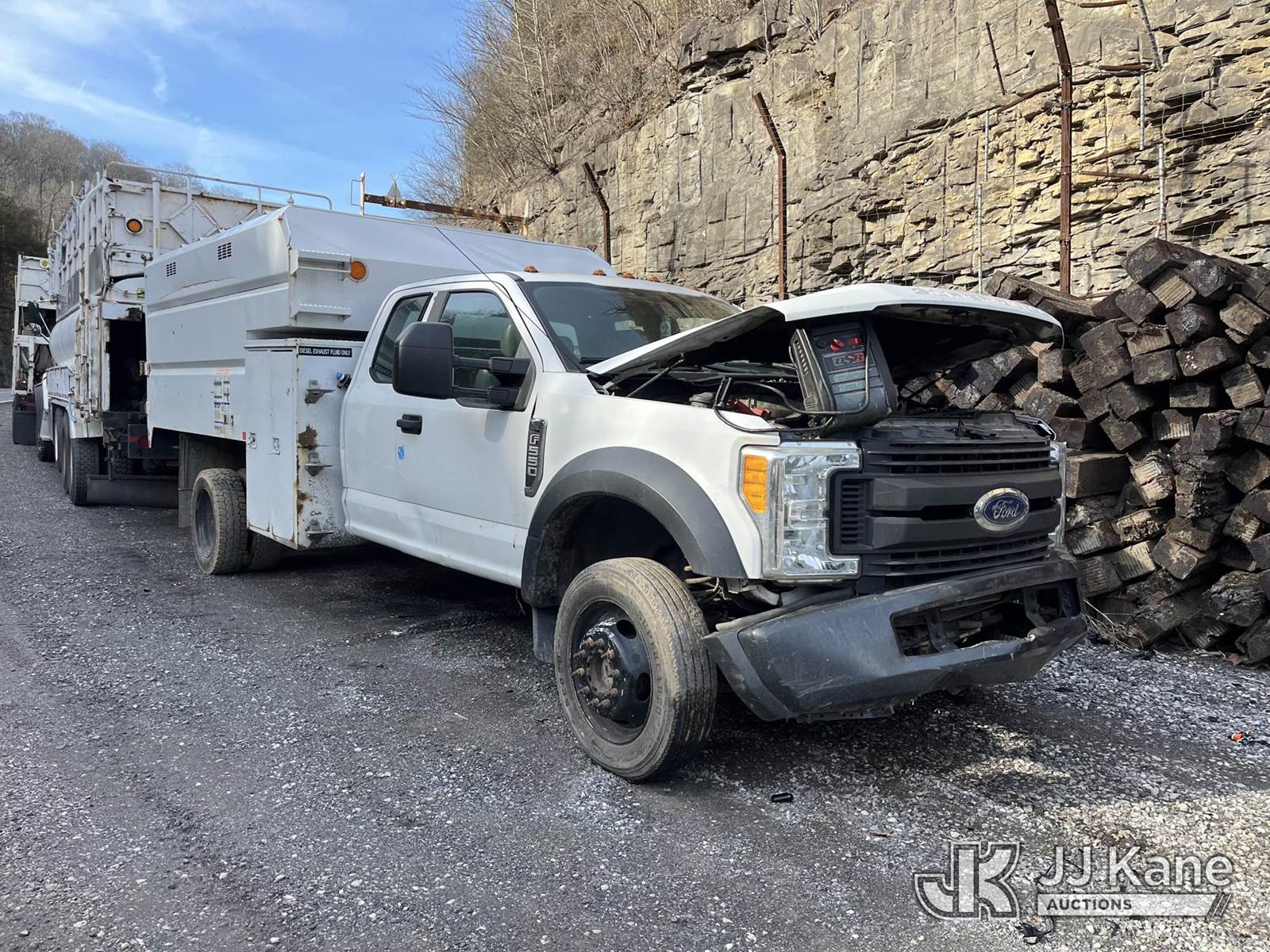 2017 Ford F-550 Chipper Dump Truck, 6.7L diesel, 4wd, Auto, (83,233 miles) (Not Running, Condition Unknown, Engine Missing Parts, Bad Rear Differential, Body Damage) (Seller States: Needs New Motor) This is a Titled Item NOTE: This unit is being sold AS IS/WHERE IS via Timed Auction and is located in Hanover, WV. Inspection & preview days for this unit are by appointment only; please contact us at contact@jjkane.com or 84-Go-JJKane for more details. (Buyer is responsible for removal. Assistance by consignor or JJ Kane Auctions is not assured.)