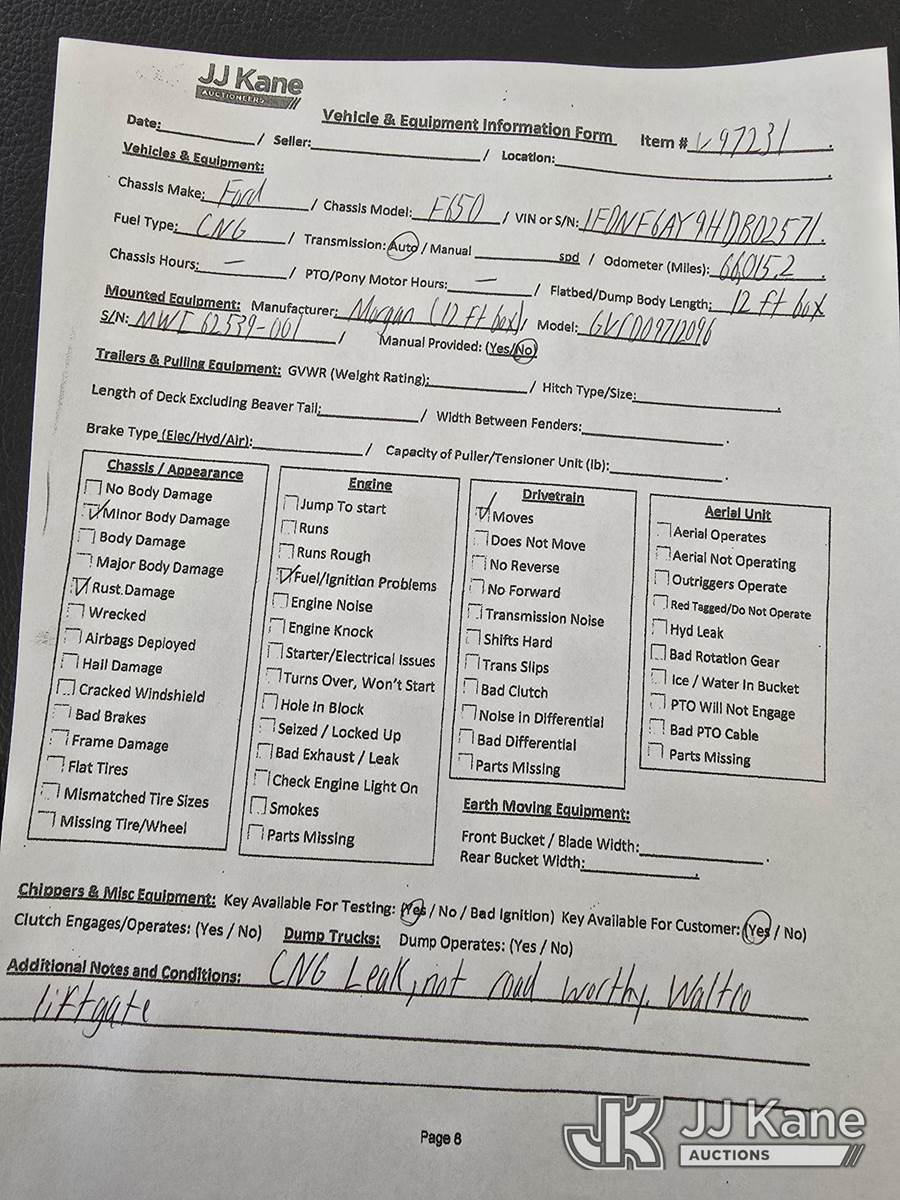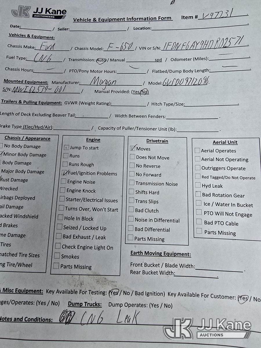 2017 Ford F650 Van Body Truck, 10-cyl, Auto, CNG Only, A/C, with 12ft Morgan body, Waltco liftgate, (66,015 miles) (CNG Leak While Running-Not ROADWORTHY) (Runs & Moves)(Fuel/Ignition Problems, Liftgate Operating Condition Unknown, Multiple Dash Warning Lights On) This is a Titled Item NOTE: This unit is being sold AS IS/WHERE IS via Timed Auction and is located in Oshkosh, WI. Inspection & preview days for this unit are by appointment only; please contact us at contact@jjkane.com or 84-Go-JJKane for more details. (Buyer is responsible for removal. Assistance by consignor or JJ Kane Auctioneers is not assured.)