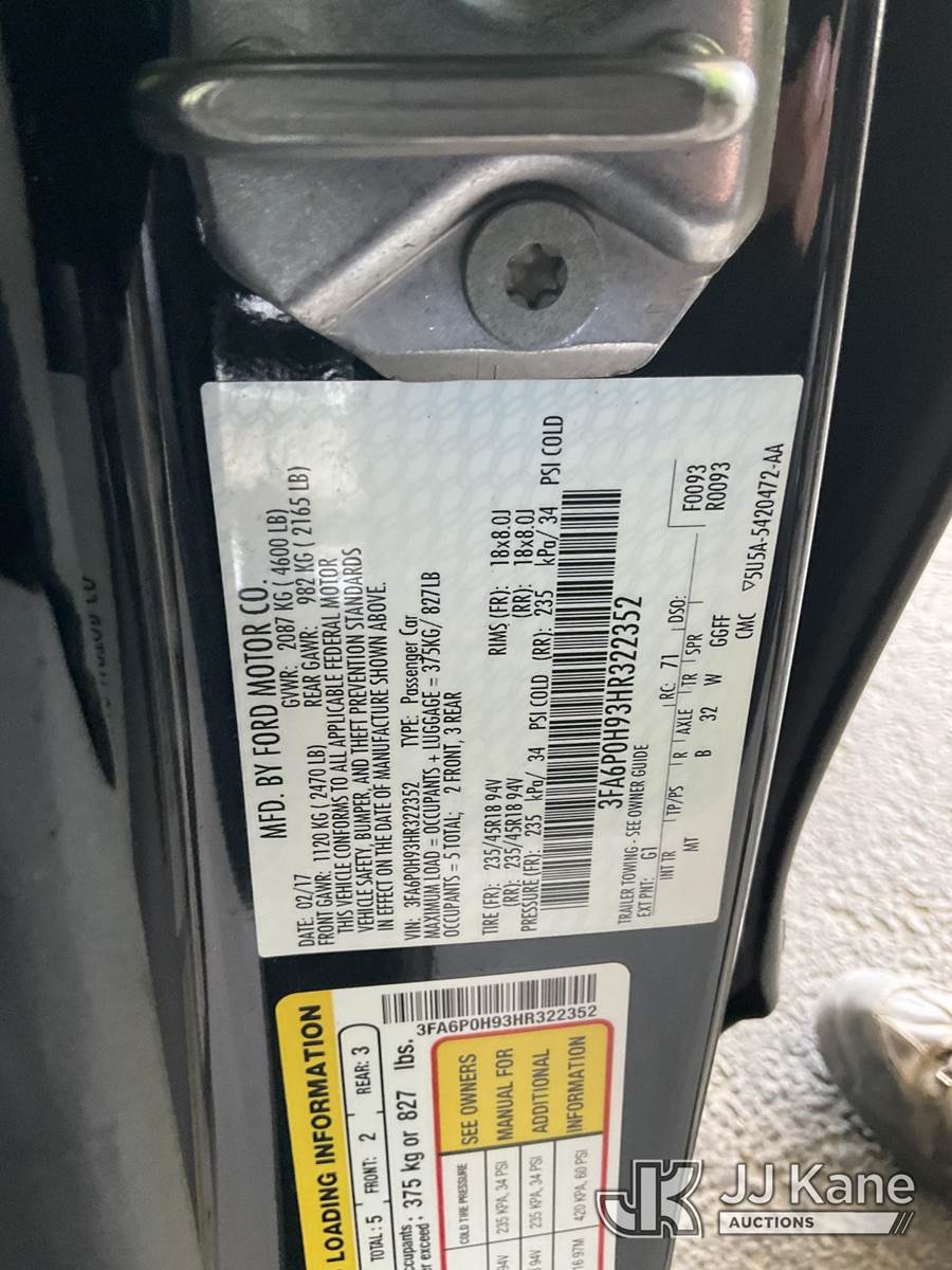 2017 Ford Fusion 4-Door Sedan, s/n 3FA6P0H93HR322352, 4-cyl gas, 6-Speed Automatic, A/C, (102,484 miles) (Runs & Moves) (No Horn, Vehicle previously used with a ‘cold plate’ or protected record registration. Due to the prior status, VIN may not yet appear in NMVTIS, which could affect DMV title/registration processing. Buyer acknowledges and accepts this) (Bidding Restricted to Licensed Vehicle Dealers Only), This is a Titled Item NOTE: This unit is being sold AS IS/WHERE IS via Timed Auction and is located in Jurupa Valley, CA. Inspection & preview days for this unit are the 2 business days prior to the first day of items closing for this auction, item is located at 4510 Muth Way Jurupa Valley, CA 92509 and hours of operations are 8a-4p. For pre-sale questions, please contact please contact Office Staff @ (310) 353-7140. Dealer License Number 45696. (Buyer is responsible for removal. Assistance by consignor or JJ Kane Auctions is not assured.)