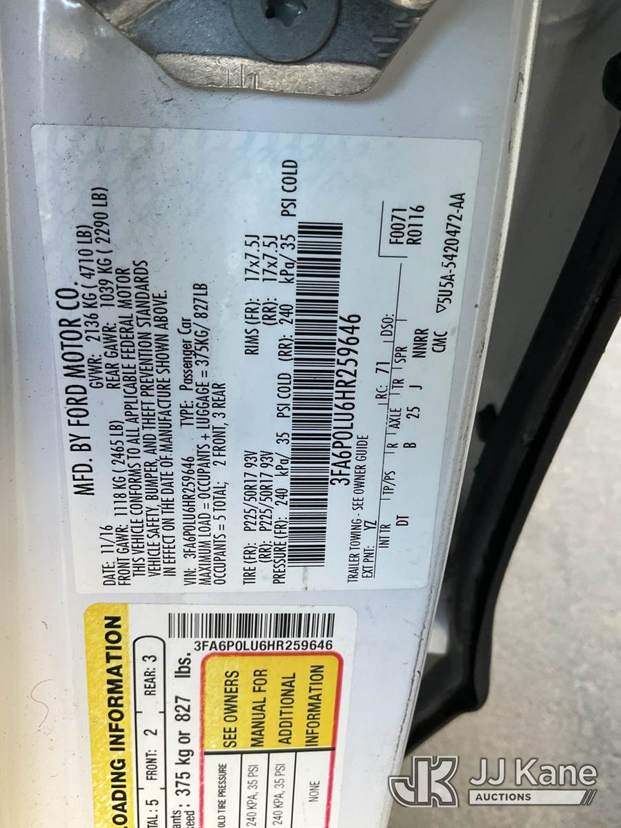 2017 Ford Fusion Hybrid 4-Door Sedan, 2.0L L4 DOHC 16V Gas/Electric FWD, Continuously Variable Transmission, A/C, (153,492 miles) (Runs & Moves) This is a Titled Item NOTE: This unit is being sold AS IS/WHERE IS via Timed Auction and is located in Jurupa Valley, CA. Inspection & preview days for this unit are the 2 business days prior to the first day of items closing for this auction, item is located at 4510 Muth Way Jurupa Valley, CA 92509 and hours of operations are 8a-4p. For pre-sale questions, please contact please contact Office Staff @ (310) 353-7140. Dealer License Number 45696. (Buyer is responsible for removal. Assistance by consignor or JJ Kane Auctions is not assured.)