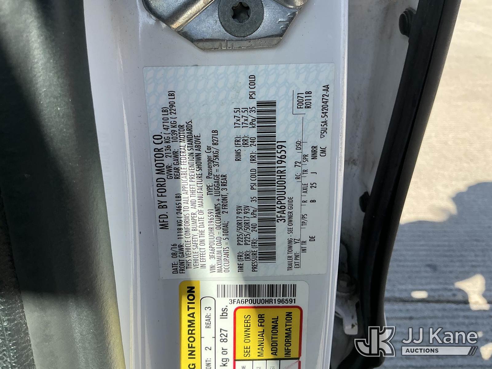2017 Ford Fusion Hybrid S 4-Door Sedan, s/n 3FA6P0UU0HR196591, 2.0L L4 DOHC 16V FWD, Hybrid, Continuously Variable Transmission, A/C, (108,451 miles) (Runs & Moves)(Low Fuel, Vehicle previously used with a ‘cold plate’ or protected record registration. Due to the prior status, VIN may not yet appear in NMVTIS, which could affect DMV title/registration processing. Buyer acknowledges and accepts this) This is a Titled Item NOTE: This unit is being sold AS IS/WHERE IS via Timed Auction and is located in Dixon, CA. Inspection & preview days for this unit are the 2 business days prior to the first day of items closing for this auction, item is located at 8668 Sparling Ln Dixon, CA 95620 and hours of operations are 8a-4p. For pre-sale questions, please contact JJ Kane Staff at (707) 678-8060 (dixon@jjkane.com). Dealer License Number 45696. (Buyer is responsible for removal. Assistance by consignor or JJ Kane Auctions is not assured.)