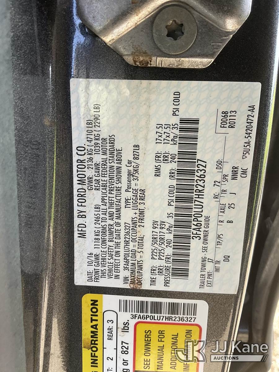 2017 Ford Fusion Hybrid SE 4-Door Hybrid Sedan, 2.0L L4 DOHC 16V HYBRID FWD, HYBRID, Continuously Variable Transmission, A/C, (165,355 miles) (Runs & Moves) This is a Titled Item NOTE: This unit is being sold AS IS/WHERE IS via Timed Auction and is located in Dixon, CA. Inspection & preview days for this unit are the 2 business days prior to the first day of items closing for this auction, item is located at 8668 Sparling Ln Dixon, CA 95620 and hours of operations are 8a-4p. For pre-sale questions, please contact JJ Kane Staff at (707) 678-8060 (dixon@jjkane.com). Dealer License Number 45696. (Buyer is responsible for removal. Assistance by consignor or JJ Kane Auctions is not assured.)