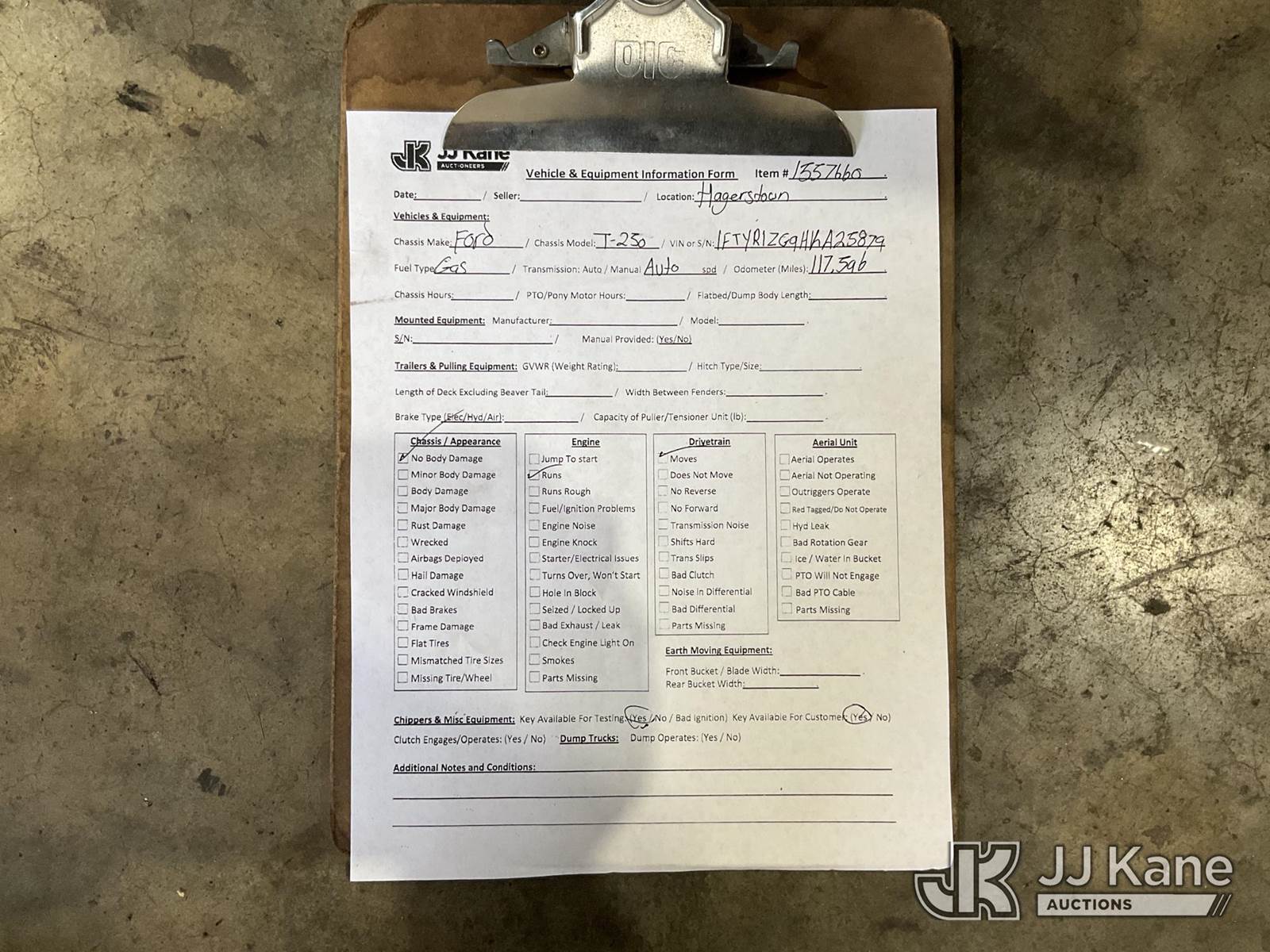 2017 Ford Transit 250 Cargo Van, 3.5L V6 Gas, Auto, RWD, A/C, (117,596 miles) (Runs & Moves) This is a Titled Item NOTE: This unit is being sold AS IS/WHERE IS via Timed Auction and is located in Hagerstown, MD. Inspection & preview days for this unit are by appointment only; please contact us at contact@jjkane.com or 84-Go-JJKane for more details. For pre-sale questions, please contact the on-site office @ (301) 895-7777 or Kevin.Waggoner@JJKane.com. Sales Tax Collected Based on Residency (Buyer is responsible for removal. Assistance by consignor or JJ Kane Auctioneers is not assured.)