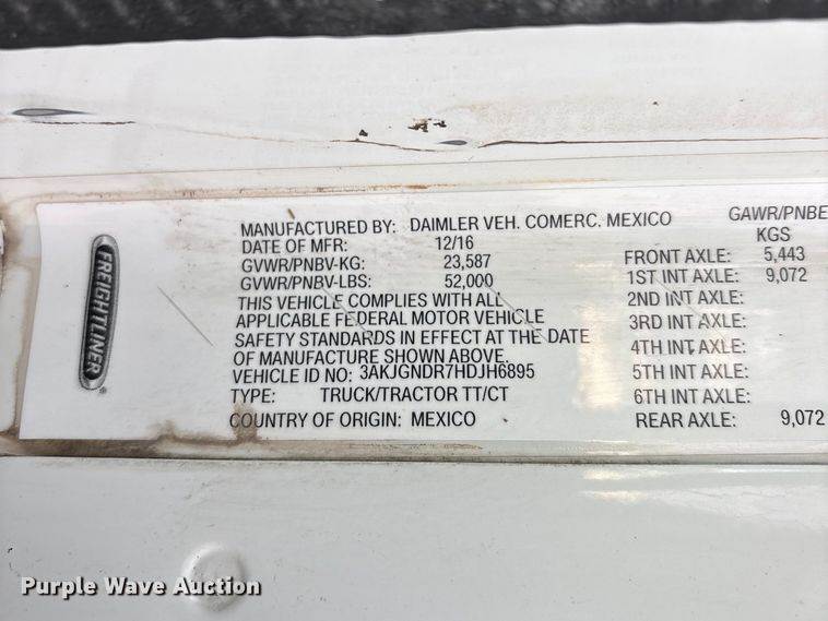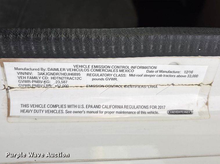 2017 Kenworth T8 Series semi truck, Miles: 648,705 on odometer, Hours: 19,108 on meter, VIN: 3WKDDP9X0HF154978, Engine, Paccar MX-13,...