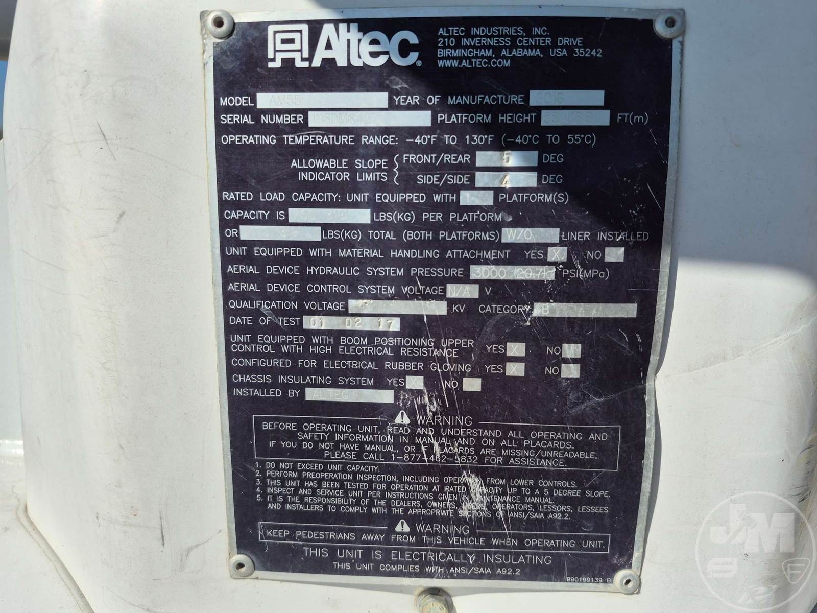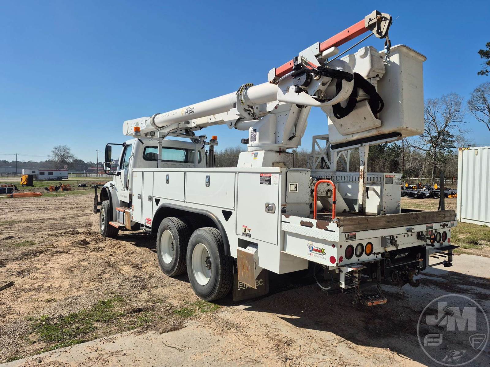 ALTEC AM55 BUCKET TRUCK, Â REAR MOUNT BOOM, BOOM SN 1116DM6427, TANDEM AXLE, ALLISON, AUTOMATIC, AWD, SPRING SUSPENSION, 128 IN. " WB, WORK HEIGHT 55', UTILITY BODY, TWO MAN BUCKET, BOOM CAPACITY 700, 4 HYDRAULIC OUTRIGGERS, 58000 GVWR, HOUR METER READS: 14462, ODOMETER READS: 175762