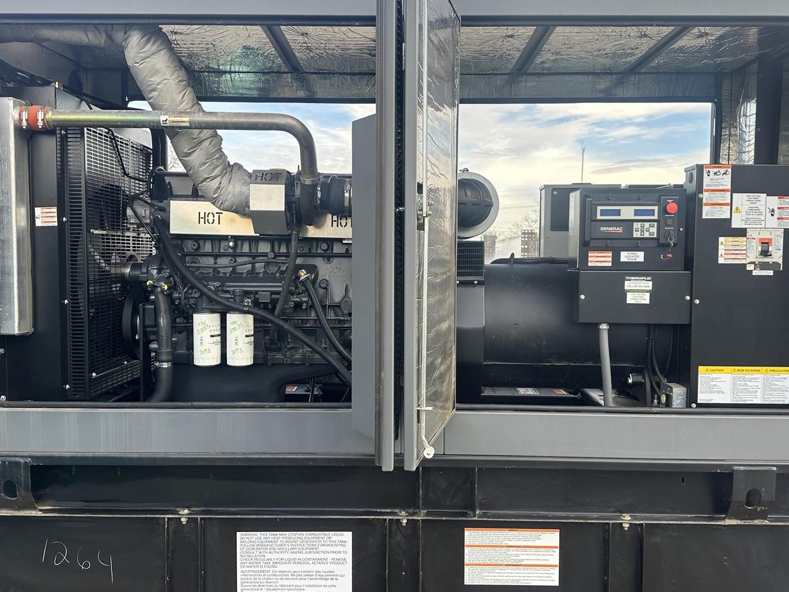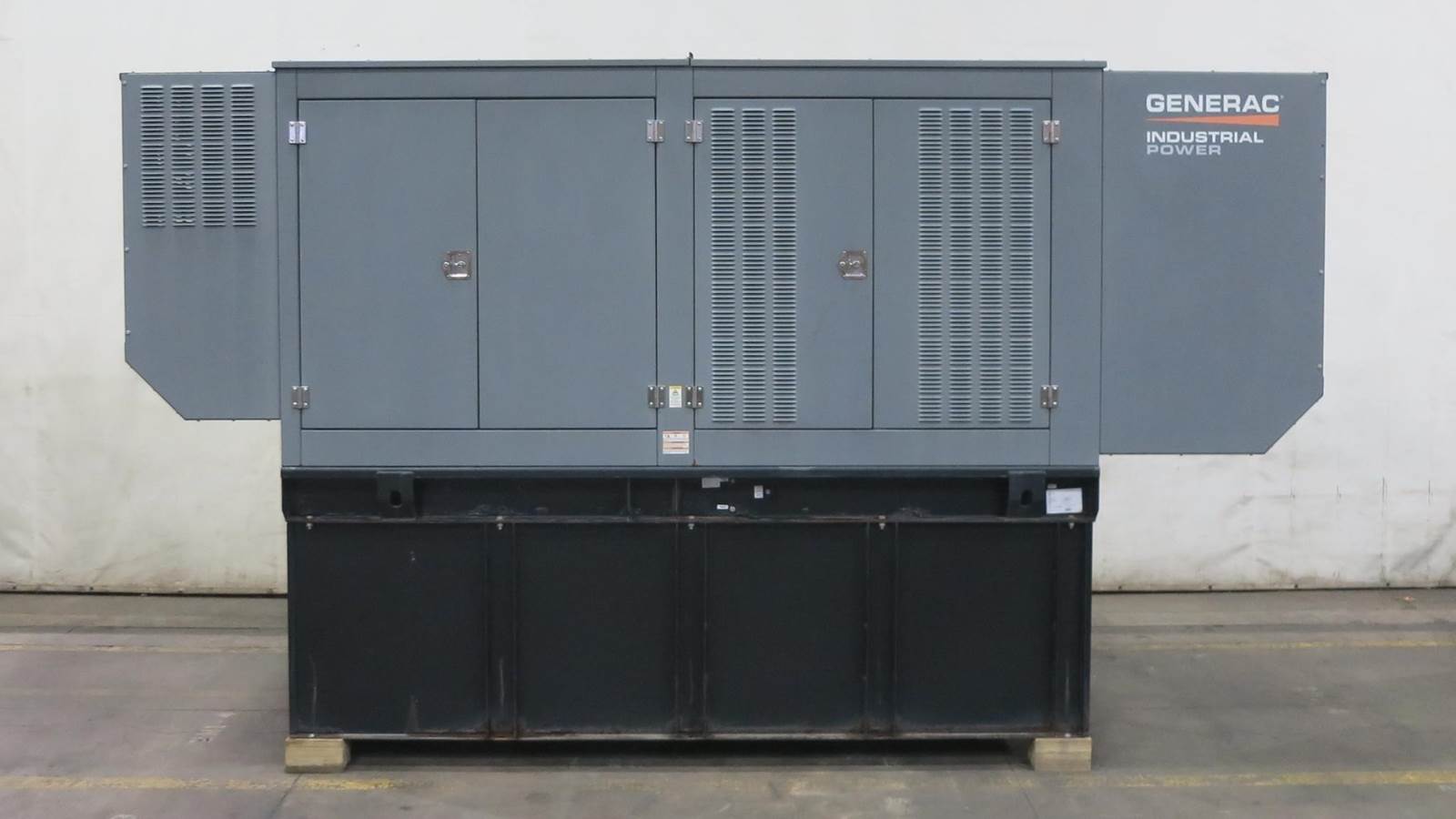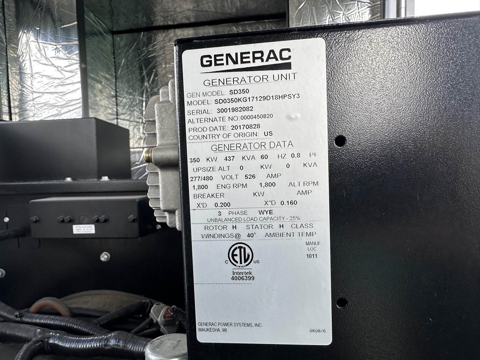 Generac 350 kW standby (315 kW prime) diesel generator set, model SD350, SN-3001982082. Iveco/FPT model F3BE9685A 12.9L engine rated 530 HP at 1800 RPM, EPA Tier 3 emissions, SN-E003-256223. 3/60/277/480V, 12 lead reconnectable to other voltages. 400 Amp and 200 Amp main-line circuit breakers. PMG - permanent magnet generator. UL listed stationary engine generator assembly. Generac H100 digital control panel. Battery charger. Coolant heater. Sound attenuated enclosure. 693 gallon UL listed sub-base fuel tank, with secondary containment. 221 Hrs. Yr 2017. Load test pending. Overall dimensions 58W x 200L x 121H on 6H blocks, 11,000 lbs. FOB Waukesha, WI