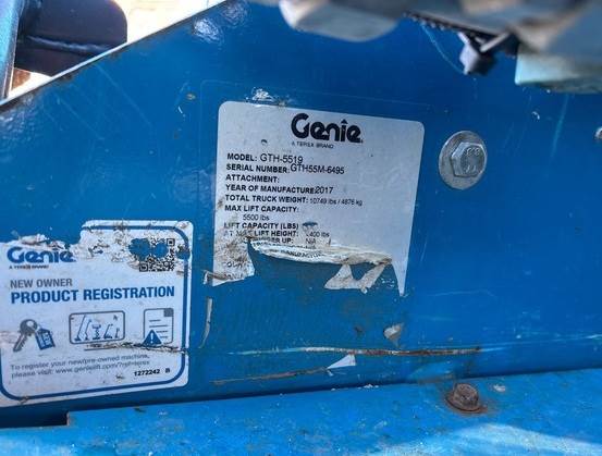 Brand/model: Genie GTH-5519 Year: 2017 Hours: 2,889 Reach: 19' Cab: Enclosed with heat Capacity: 5,500 lbs Tires: Foam Power: Diesel Other: Auxiliary hydraulics, Oil pan heater SKU #: LL26-002