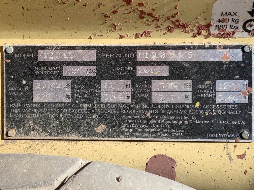 2017 JLG 1230ES PERSONNEL LIFT, electric, 12' lift, 474 hours indicated. s/n:M130001465