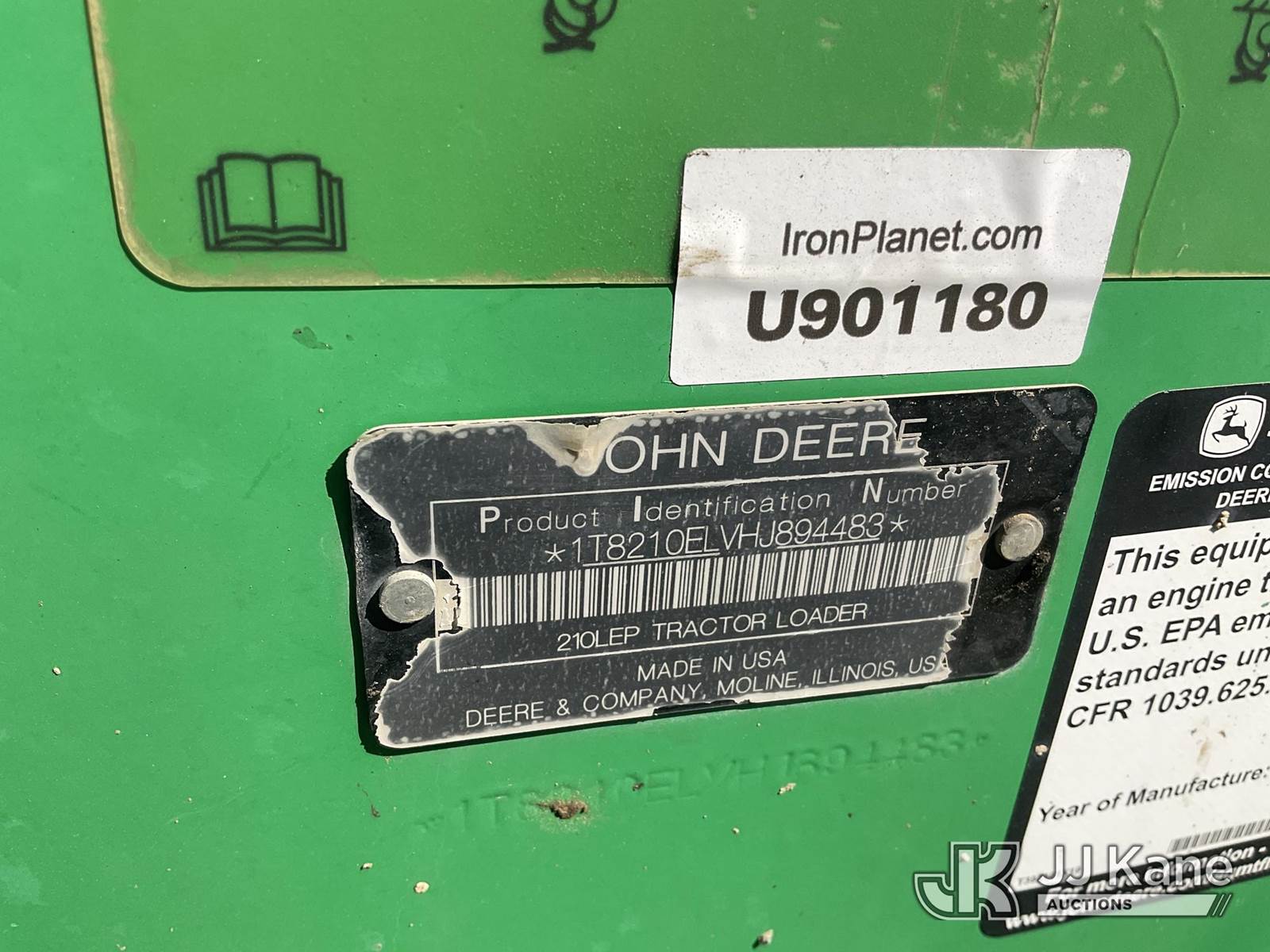 2017 John Deere 210L EP Tractor Loader, s/n 1T8210ELVHJ894483, diesel, powershift, with 4 in 1 bucket, 3-point hitch, front & rear aux hyd, rear wheel weights & OROPS, (Runs & Operates) (Reads 2,559 hours) May be subject to ARB Regulations NOTE: This unit is being sold AS IS/WHERE IS via Timed Auction and is located in Jurupa Valley, CA. Inspection & preview days for this unit are the 2 business days prior to the first day of items closing for this auction, item is located at 4510 Muth Way Jurupa Valley, CA 92509 and hours of operations are 8a-4p. For pre-sale questions, please contact please contact Office Staff @ (310) 353-7140. Dealer License Number 45696. (Buyer is responsible for removal. Assistance by consignor or JJ Kane Auctions is not assured.)