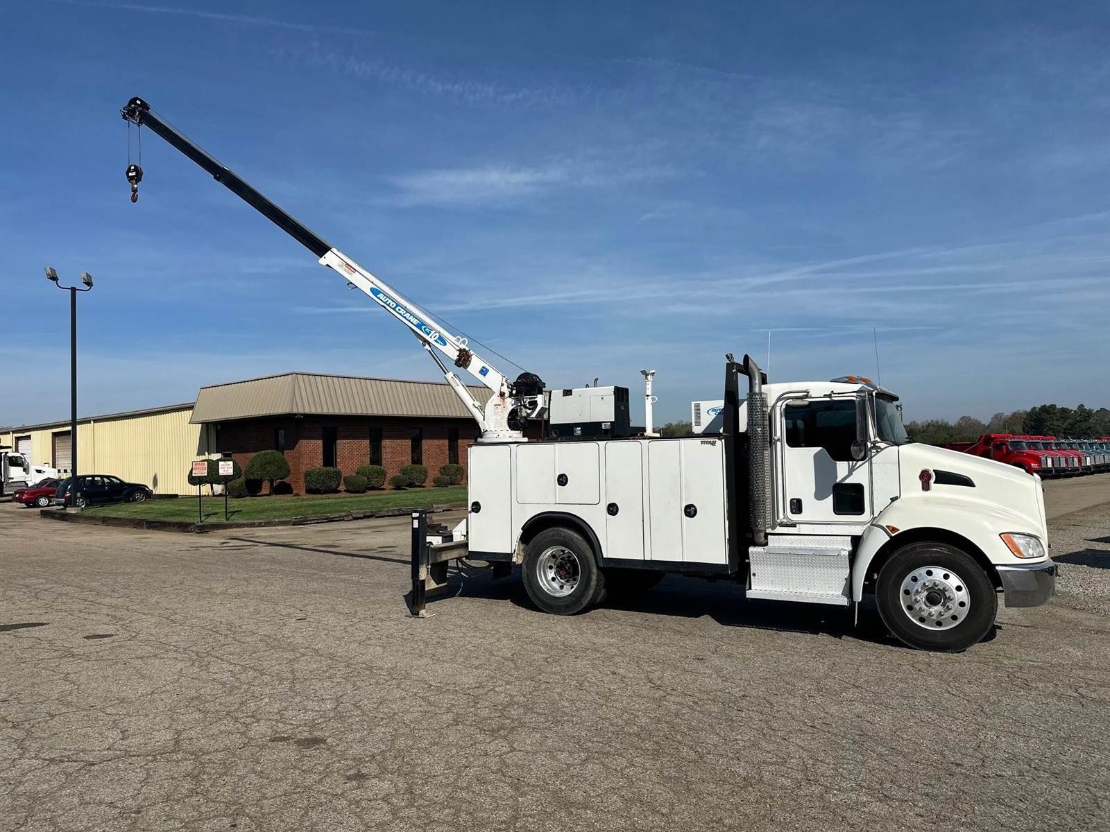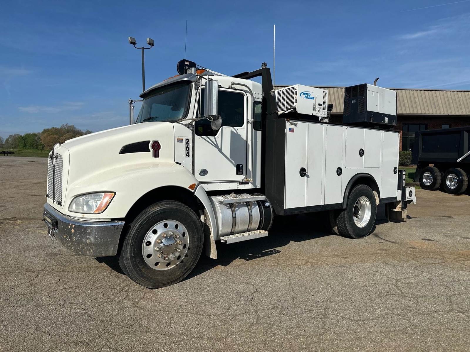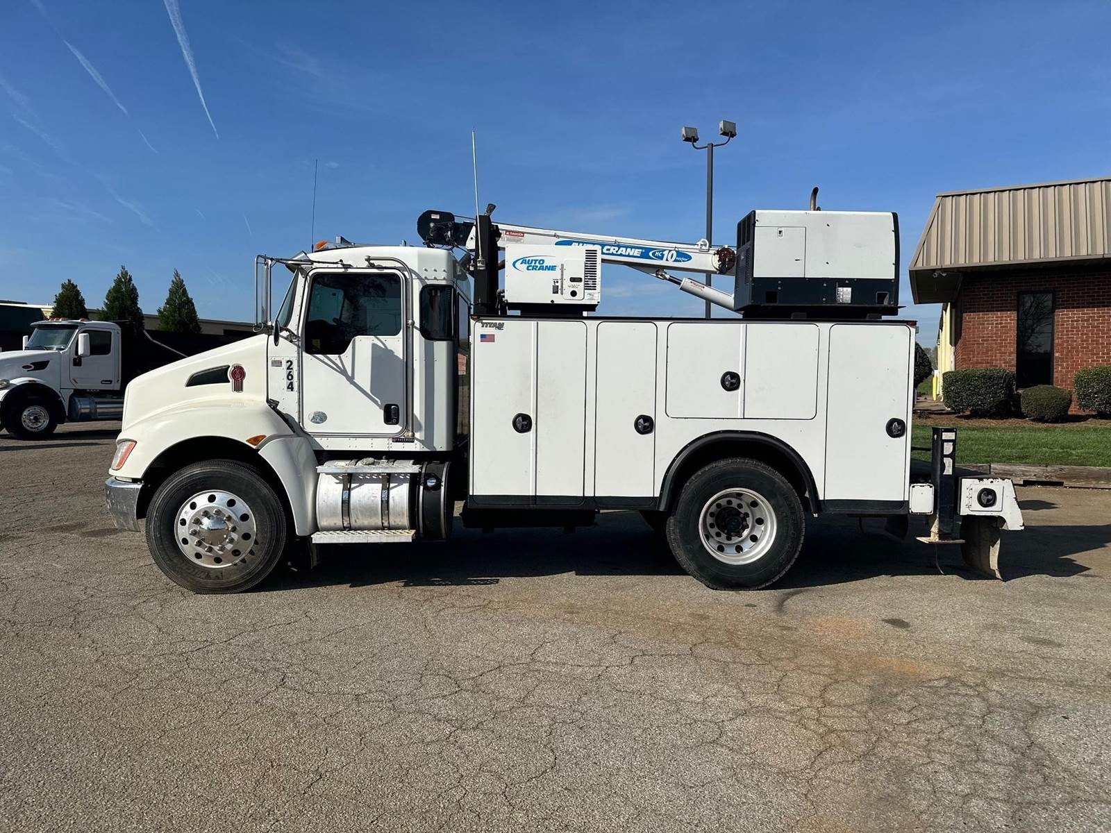 2017 Kenworth T270 --- Single Axle, PX9 Paccar 300 HP, Allison Automatic 6 Speed, 5.25 Ratio, 10,000 Front Axle, 16,000 Rear Axle, 157" Wheelbase, Air Ride Suspenison, Air Brake, Differential Lock, Reese Hitch, 11' Steel AUTOCRANE Titan Service Body, Tool Tray Bins, Hobart Welder/Generator (11,000 watt), Autocrane Hydraulic Air Compressor, Dual Hydraulic Outriggers, Vise, Hose Reel, Wireless Remote, AutoCrane HC10 Series Crane with 10,000 Lb. Capacity, Strobe Lights, Aluminum Front Wheels, Aluminum Rear Wheels, 56 Gallon Aluminum Fuel Tank, Daylite Doors, Peep Window, High Level Interior, Wood Grain Dash, Heated Mirrors, Cruise Control, Tilt Steering Wheel, AM/FM Bluetooth Radio, Power Passenger Window, Power Door Locks, P/S, AC.