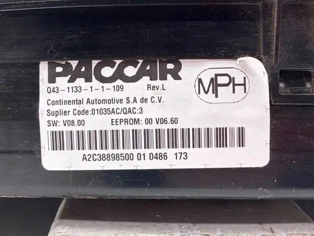 (Used) 2017 Kenworth T680, INSTRUMENT CLUSTER- Part Number: Q43-1133-1-1-109, Serial Number: A2C38898500 01 0486 173, Suplier Code: 01035AC/QAC:3, SW: V08.00, EEPROM: 00 VO6.60, Gauges: Battery Volts, Oil Pressure, Water Temp, RPM, Fuel Level, Speed, Brake App, Air Pressure (2), Def Level, For more information about this item, give us a call.We ship Worldwide! (CRG HEAVY TRUCK PARTS) 929 W PULASKI HWY ELKTON, MD 21921, Engine Make: PACCAR, Engine Model: MX13