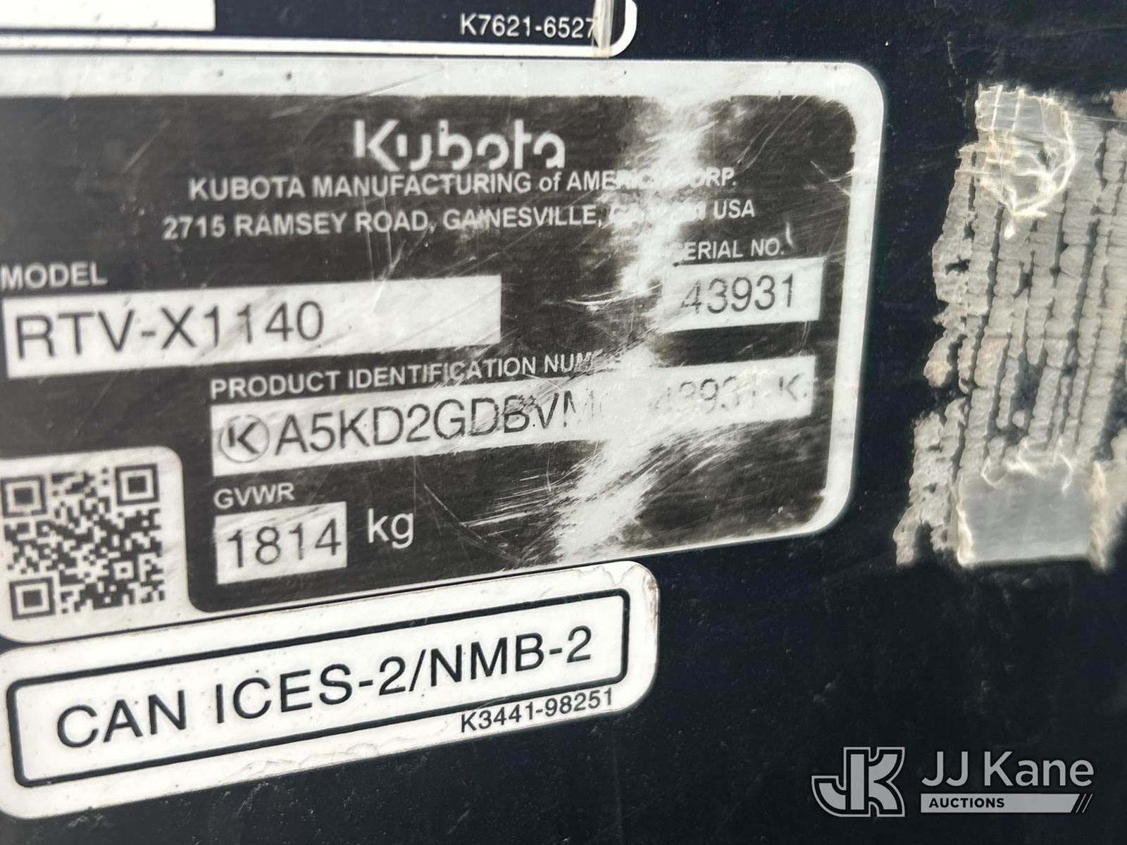 2017 Kubota RTV-X1140 All-Terrain Vehicle, s/n A5KD2GDBVMG043931, Kubota diesel, Auto, (15,058 miles) 2017 Kubota RTVX1140WH Side By Side 4-Seat Cart (Not Titled) (Runs & Moves) (Flat Tire, Damaged Rim) NOTE: This unit is being sold AS IS/WHERE IS via Timed Auction and is located in Waxahachie, TX. Inspection & preview days for this unit are the 2 business days prior to the first day of items closing for this auction, item is located at 999 Solon Rd Waxahachie, TX 75165 and hours of operations are 8a-4p. For pre-sale questions, please contact Alex Bayless @ (469) 550-4938. (Buyer is responsible for removal. Assistance by consignor or JJ Kane Auctions is not assured.)