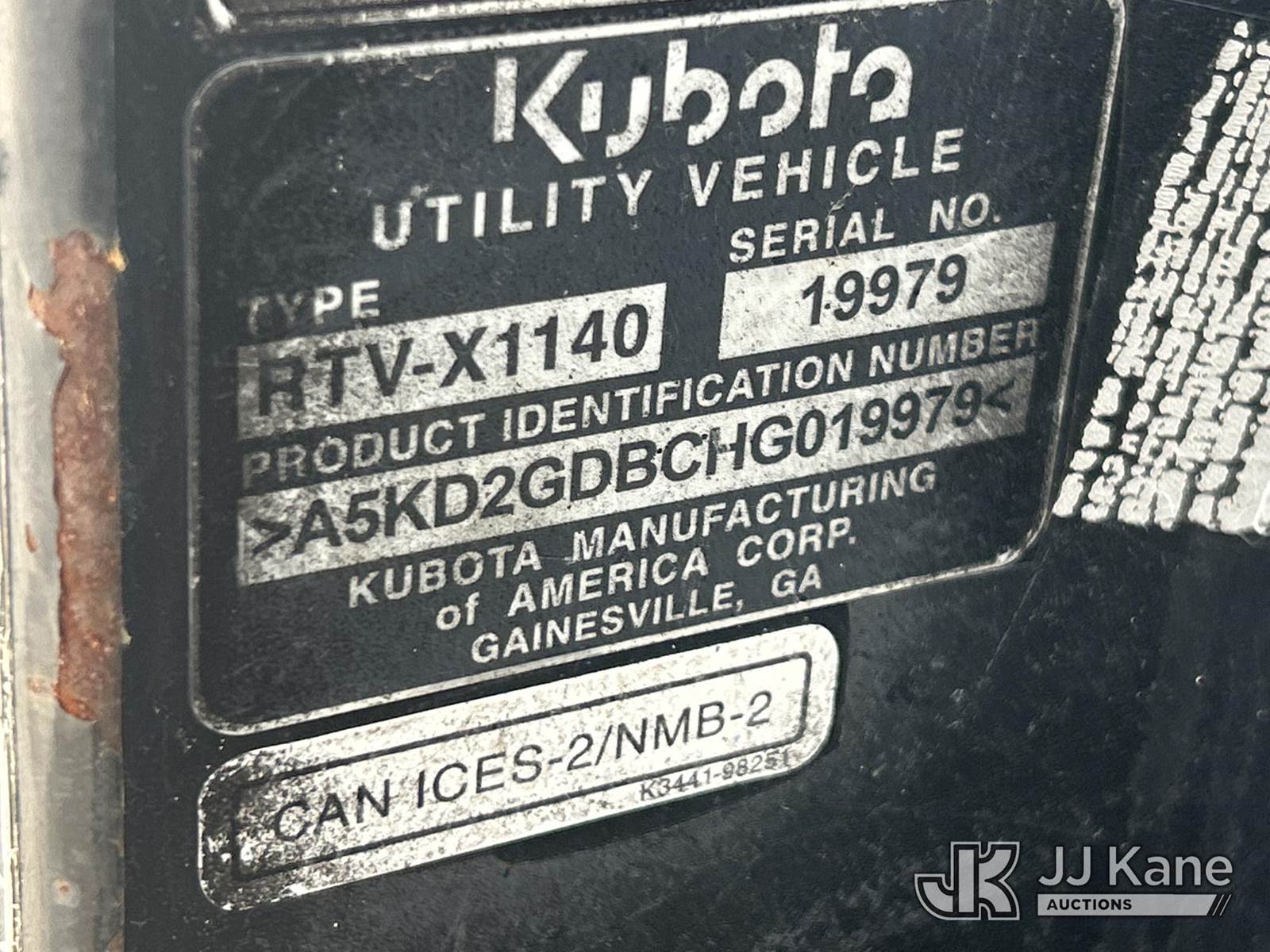 2017 kubota RTV-X1140 All-Terrain Vehicle, s/n A5KD2GDBCHG019979, Kubota diesel, auto, with ROPS, (20,171 miles) 2017 Kubota RTVX1140WH Side By Side 4-Seat Cart (Not Titled) (Runs & Moves) NOTE: This unit is being sold AS IS/WHERE IS via Timed Auction and is located in Waxahachie, TX. Inspection & preview days for this unit are the 2 business days prior to the first day of items closing for this auction, item is located at 999 Solon Rd Waxahachie, TX 75165 and hours of operations are 8a-4p. For pre-sale questions, please contact Alex Bayless @ (469) 550-4938. (Buyer is responsible for removal. Assistance by consignor or JJ Kane Auctions is not assured.)