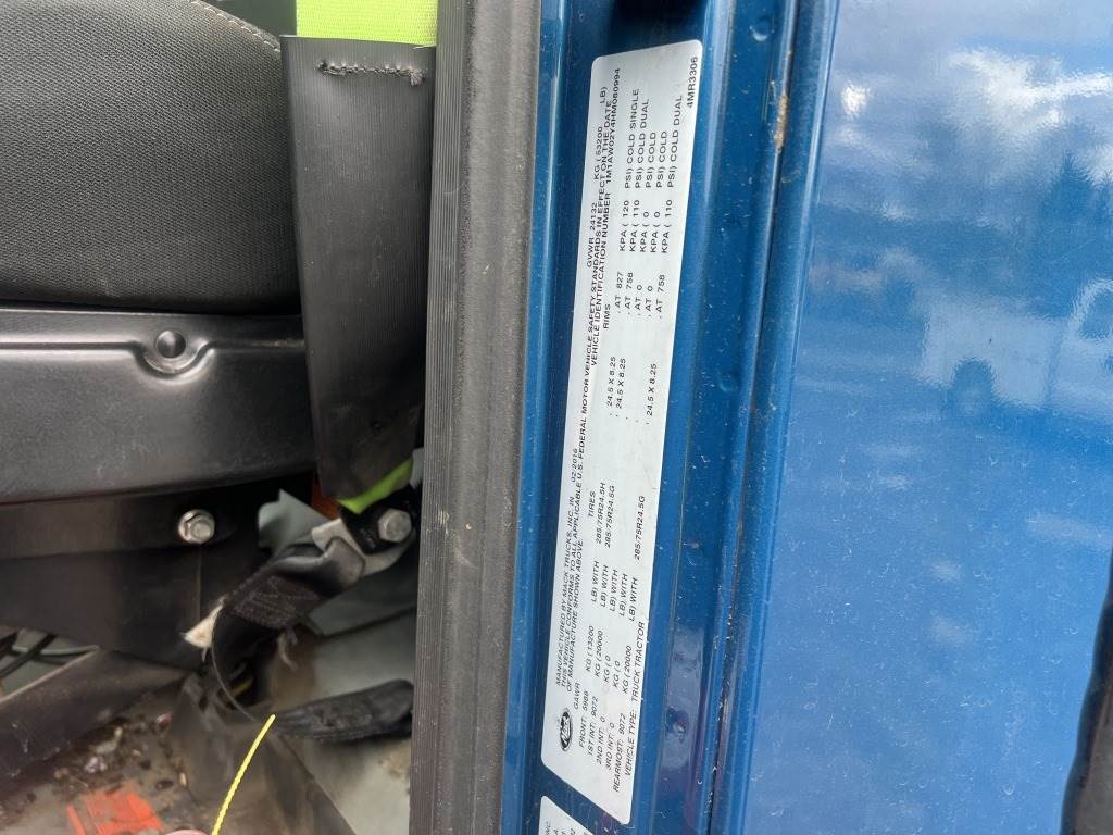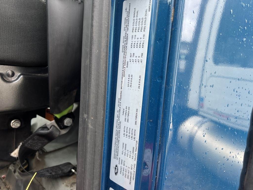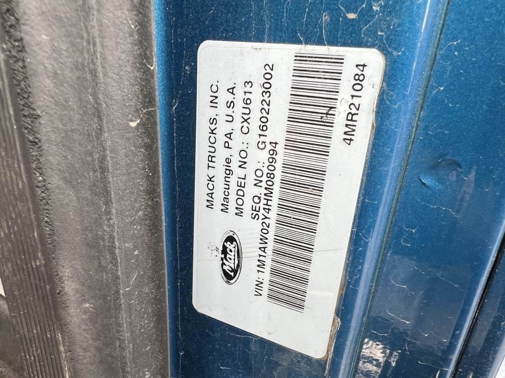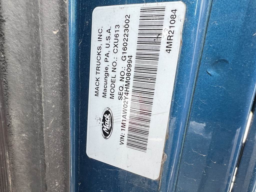 Location: Washougal WA ***End-User Consignment*** VIN: 1M1AW02Y4HM080994 Engine: Mack MP7 10.8L Diesel Transmission: Automatic *Body damage* Stationary 5th wheel, lift axle, ProTech chain hangers, trailer air supply, air brakes, power/heated mirrors, 29,714 engine hours, cruise control, PTO, engine brake, diff lock, A/C, AM/FM/CD, CB radio, air ride suspension, 285/75R24.5 front tires, 255/70R22.5 lift tires, 285/75R24.5 rear tires. Miles: 963,285