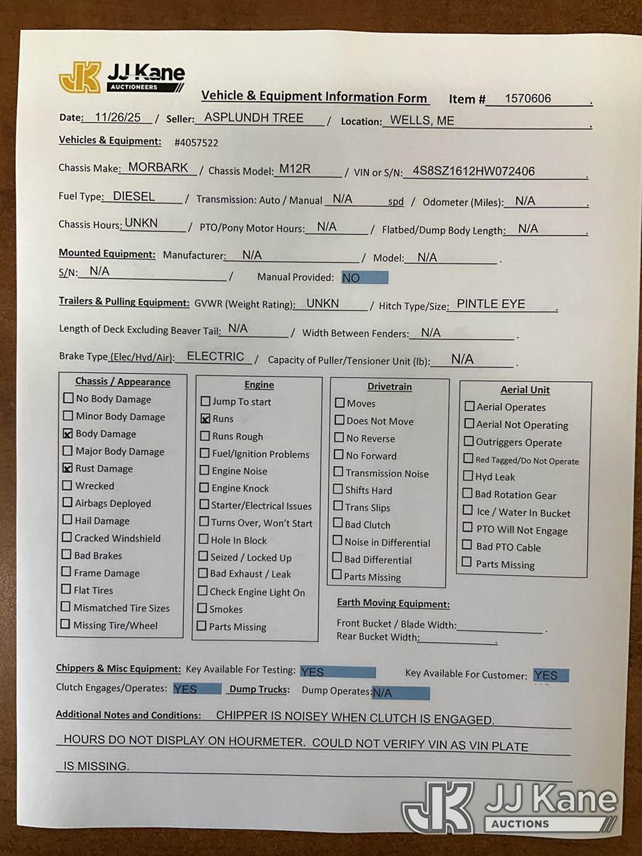 2017 Morbark M12R Chipper (12in Drum), Cat 3.4B diesel, trailer mtd. (Runs, Chipper Is Noisy When Clutch Is Engaged, Hours Unknown, Rust Damage) (Seller States: The chipper needs the drum bearings replaced.) This is a Titled Item NOTE: This unit is being sold AS IS/WHERE IS via Timed Auction and is located in Wells, ME. Inspection & preview days for this unit are by appointment only; please contact us at contact@jjkane.com or 84-Go-JJKane for more details. (Buyer is responsible for removal. Assistance by consignor or JJ Kane Auctioneers is not assured.)