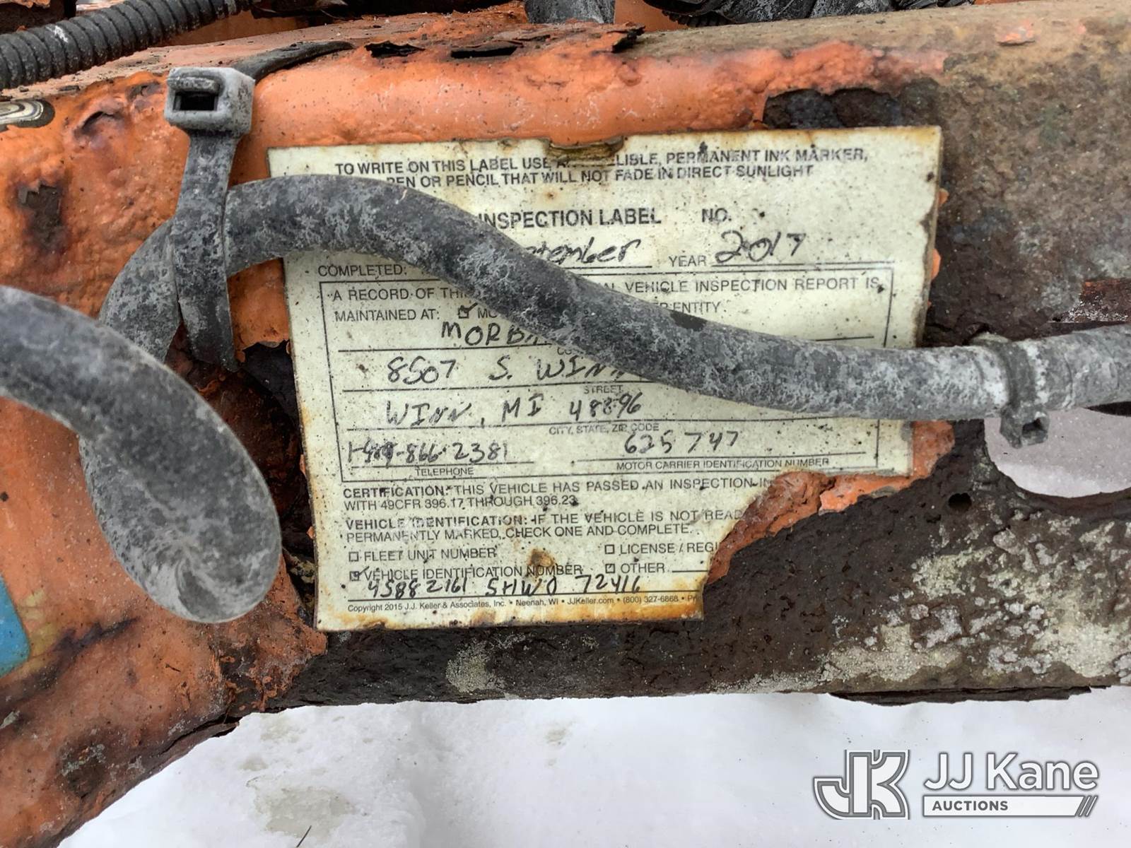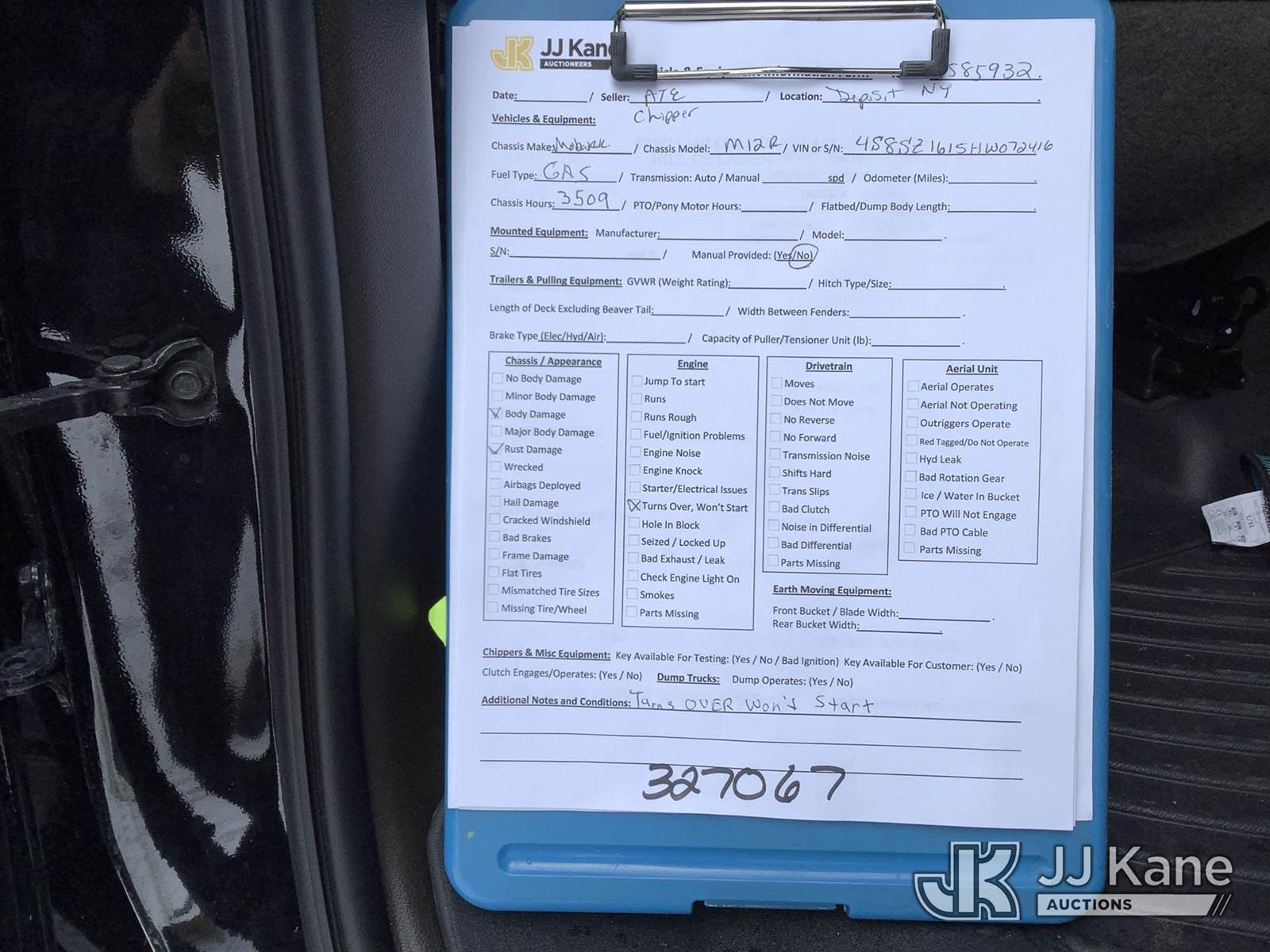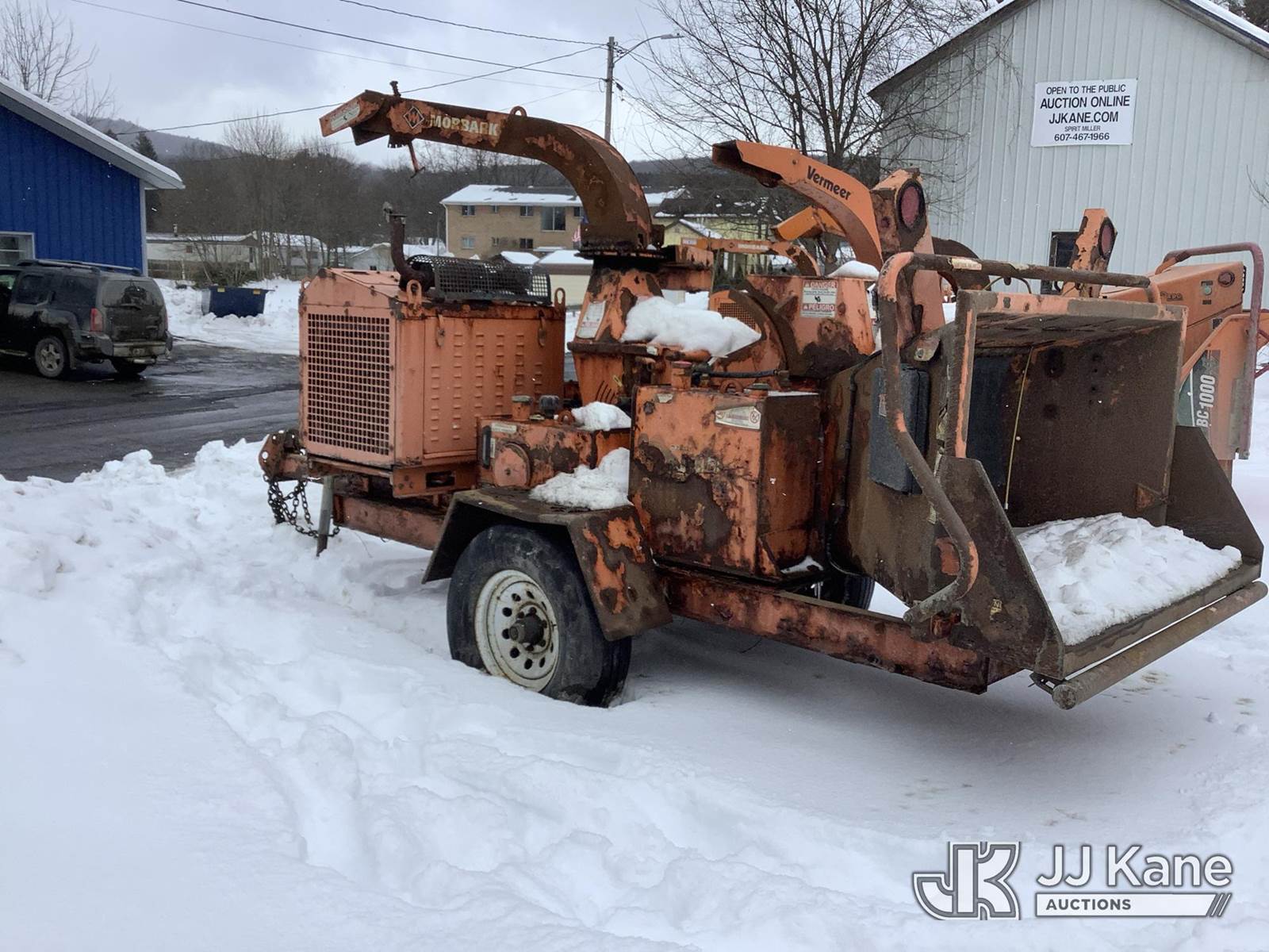 2017 Morbark M12R Chipper (12in Drum), s/n 4S8SZ1615HW072416, 4-cyl gas, trailer mtd. (Not Running, Turns Over Won’t Start, Condition Unknown, Body/Rust Damage) (Seller States: Starter and electrical issues. Hydraulic pump and drum bearing failure) (Reads 3,509 hours) NOTE: This unit is being sold AS IS/WHERE IS via Timed Auction and is located in Deposit, NY. Inspection & preview days for this unit are by appointment only; please contact us at contact@jjkane.com or 84-Go-JJKane for more details. (Buyer is responsible for removal. Assistance by consignor or JJ Kane Auctions is not assured.)