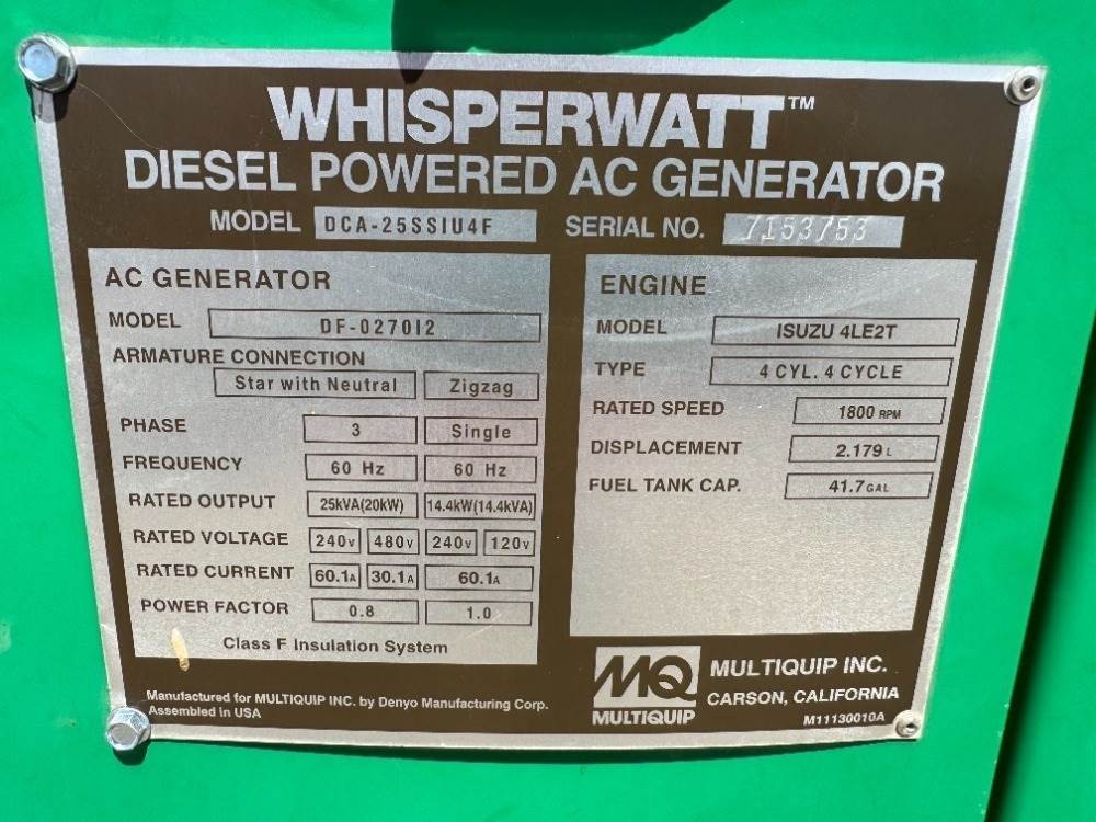 2017 MULTIQUIP DCA25SSIU4FSG GENERATOR, 20kw, Isuzu diesel, portable, 2,150 hours indicated. s/n:7153753