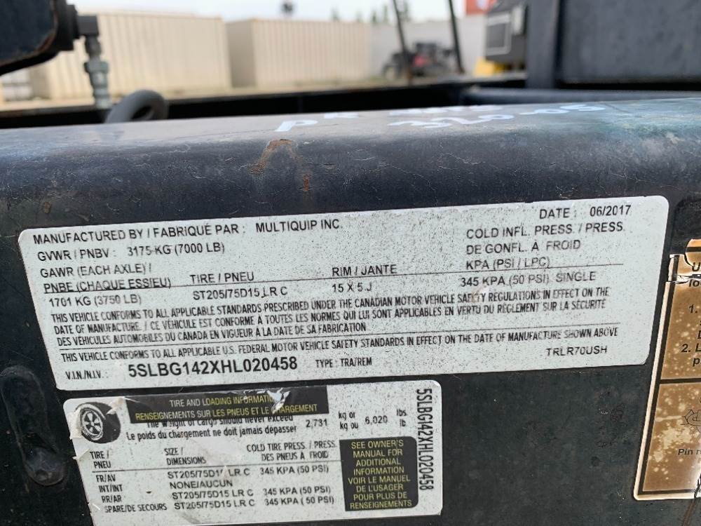 2017 MULTIQUIP DCA70SSIU4F GENERATOR, 56kw, Isuzu diesel, portable. s/n:7354035; Trailer s/n:5SLBG142XHL020458