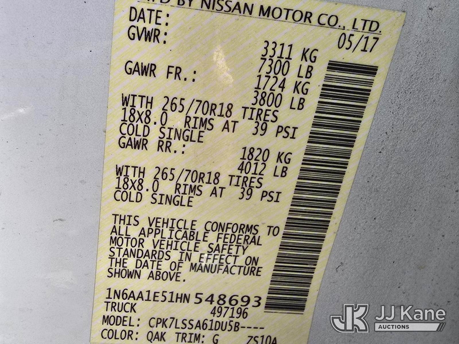 2017 Nissan Titan 4x4 Crew-Cab Pickup Truck, 5.6L V8 DOHC 32V gas, 6-Speed Automatic, A/C, (78,108 miles) (Runs & Moves) (Jump To Start) This is a Titled Item NOTE: This unit is being sold AS IS/WHERE IS via Timed Auction and is located in Greeley, CO. For more information contact Austin Scott @ (816) 205-2291. Removal by appointment only, Buyer/Hauler must present copy of paid invoice or release form upon arrival. Purchaser acknowledges ALL lots must be removed within 10 business days of Auction, or a storage fee may be incurred. For load out and pick up information, please reference the release form sent out after purchase. (Buyer is responsible for removal. Assistance by consignor or JJ Kane Auctions is not assured). Dealer License Number 47109. (Buyer is responsible for removal. Assistance by consignor or JJ Kane Auctions is not assured.)