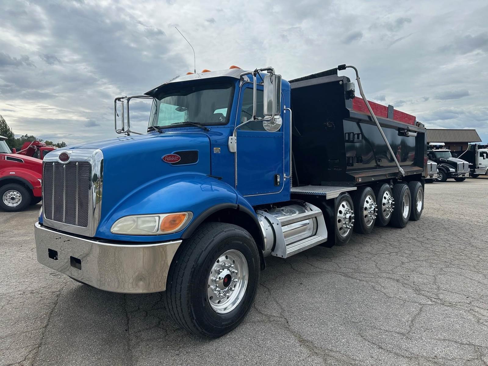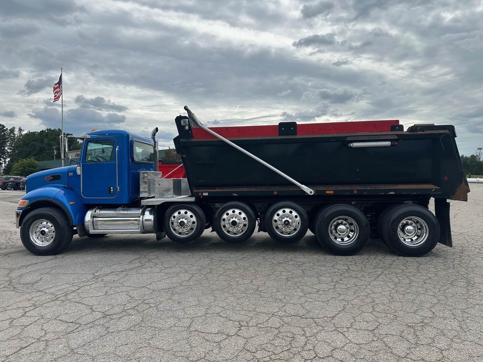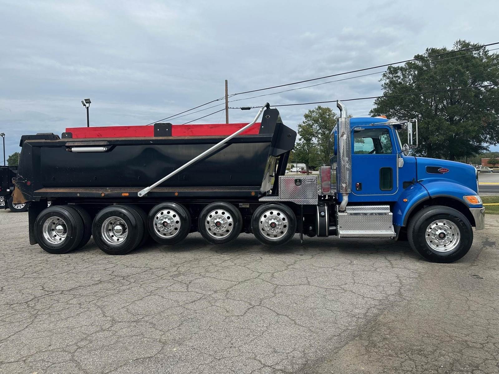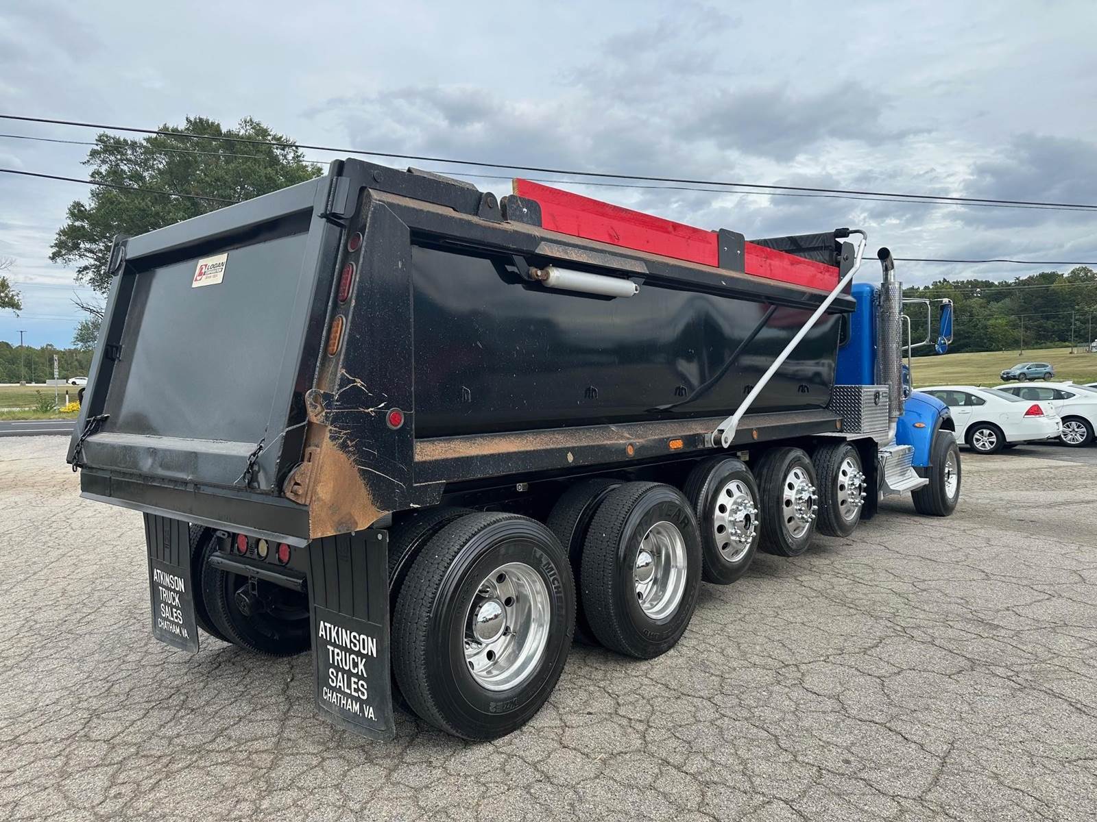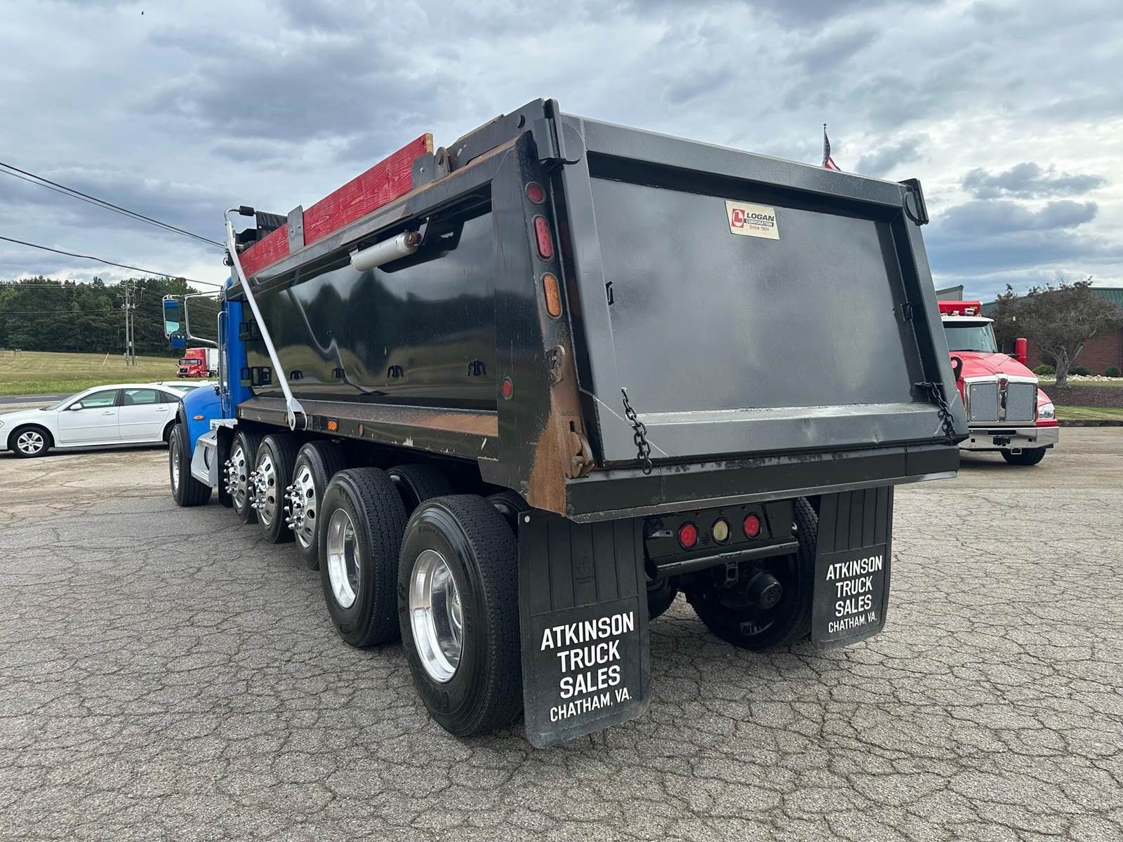 2017 Peterbilt 348 --- Quint Axle(6), PX9 Paccar 350 HP, Allison Automatic 6 Speed, 6.17 Ratio, 18,740 Front Axle, 40,000 Rear Axle, 280" Wheelbase, 25' 7" Bridge, Chalmers, Double Frame, 3 Stage Engine Brake, Air Brake, Axle & Differential , Reese Hitch, 18.5' Steel Logan Dump Body, 48" Sides, High Lift Gate, Air Gate, Electric Tarp, 3 Steerable Lift Axles, All Aluminum, Single Stack, Aluminum Fuel Tank, Peep Window, Air Ride Cab, Dual High Back Seats, High Level Interior, Chrome Gauge Package, Heated Mirrors, Cruise Control, Tilt Steering Wheel, AM/FM, Passenger Power Window, P/S, AC.