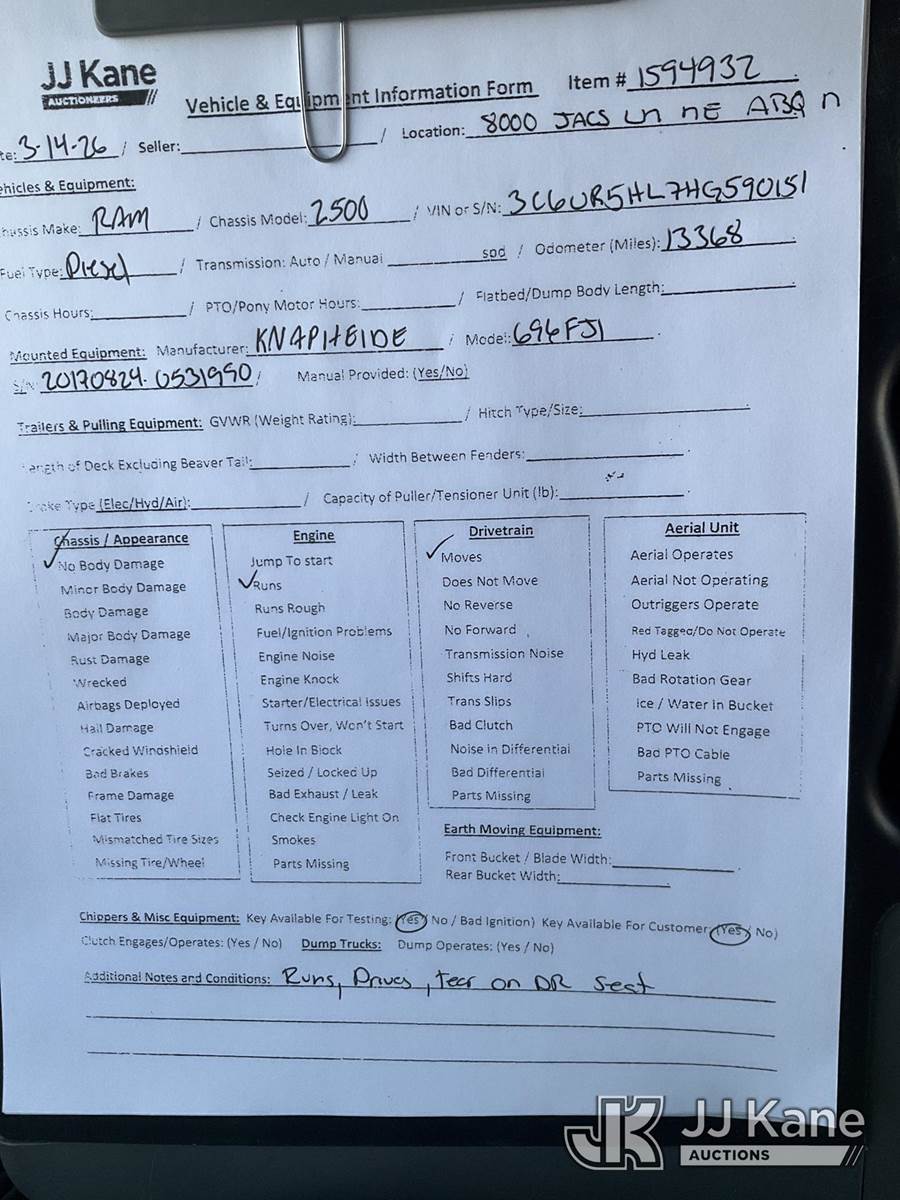 2017 RAM 2500 Tradesman Crew Cab LWB 4WD Crew-Cab Service Truck, 6.7L L6 OHV 24V TURBO DIESEL 4WD, DIESEL, Auto, A/C, (133,681 miles) (Runs & Moves) This is a Titled Item NOTE: This unit is being sold AS IS/WHERE IS via Timed Auction and is located in Albuquerque, NM. Inspection & preview days for this unit are by appointment only; please contact us at contact@jjkane.com or 84-Go-JJKane for more details. (Buyer is responsible for removal. Assistance by consignor or JJ Kane Auctions is not assured.)