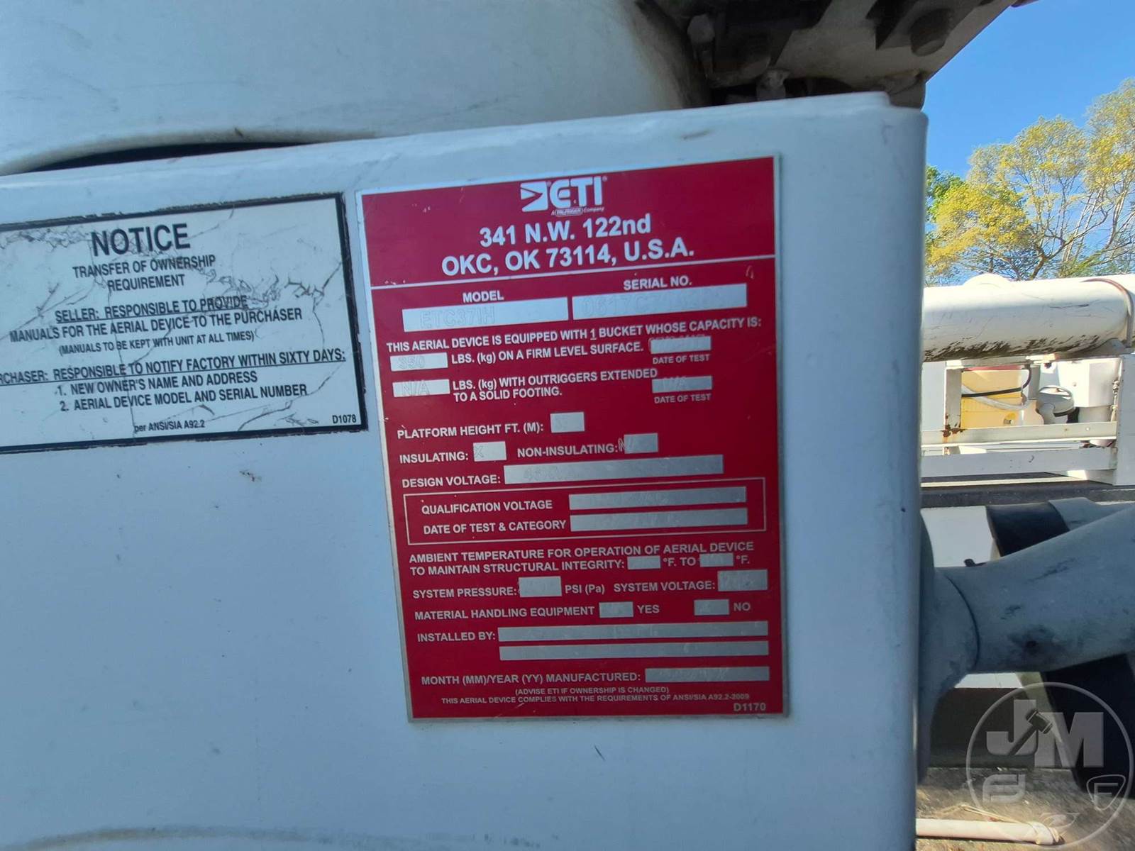S/A BUCKET TRUCK, ETI, ETC37HI, CUMMINS, 6.7L TURBO DIESEL, AUTOMATIC, 4WD, SPRING RIDE SUSP, 144" WB, FRONTS 7.25K, REARS 13.5K, C/A: 60", DISC WHEELS, AISIN 6-SPEED AUTOMATIC (AS69RC), TIRES 245/70R19.5, ODOMETER READS: CNV, ***INOP***