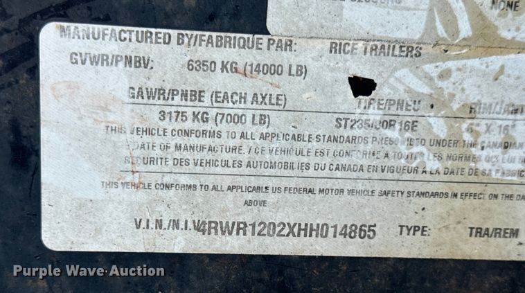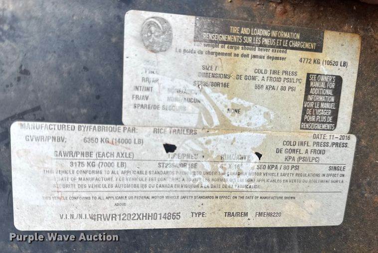 2017 Rice FMEH8220 equipment trailer