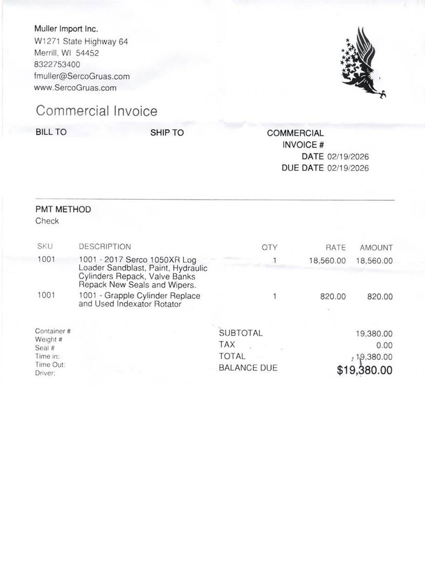2017 Serco 1050 XR, 28.5' boom length, outside joystick, continuous rotation suregrip grapple, fresh rebuild (service records in photos)