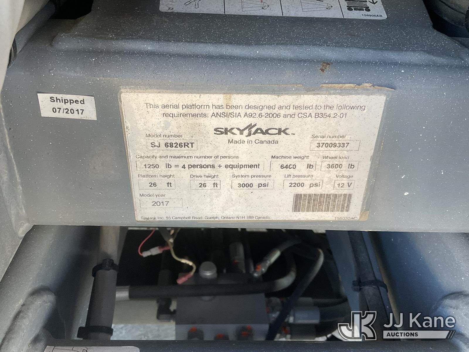 2017 SkyJack SJ6826RT Self-Propelled Scissor Lift, s/n 37009337, 3-cyl Dual Fuel (LPG & Gas), Hydraulic Drive, (Runs, Operates With Lower Control, Upper Controls Do Not Operate) (Reads 2,353 hours) NOTE: This unit is being sold AS IS/WHERE IS via Timed Auction and is located in Dixon, CA. Inspection & preview days for this unit are the 2 business days prior to the first day of items closing for this auction, item is located at 8668 Sparling Ln Dixon, CA 95620 and hours of operations are 8a-4p. For pre-sale questions, please contact JJ Kane Staff at (707) 678-8060 (dixon@jjkane.com). Dealer License Number 45696. (Buyer is responsible for removal. Assistance by consignor or JJ Kane Auctions is not assured.)
