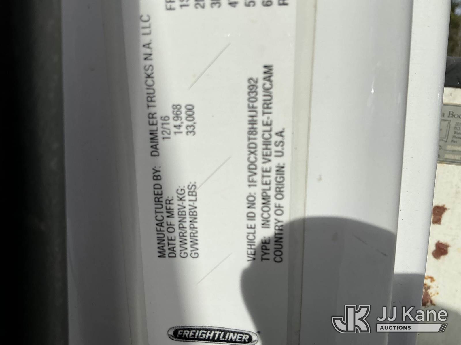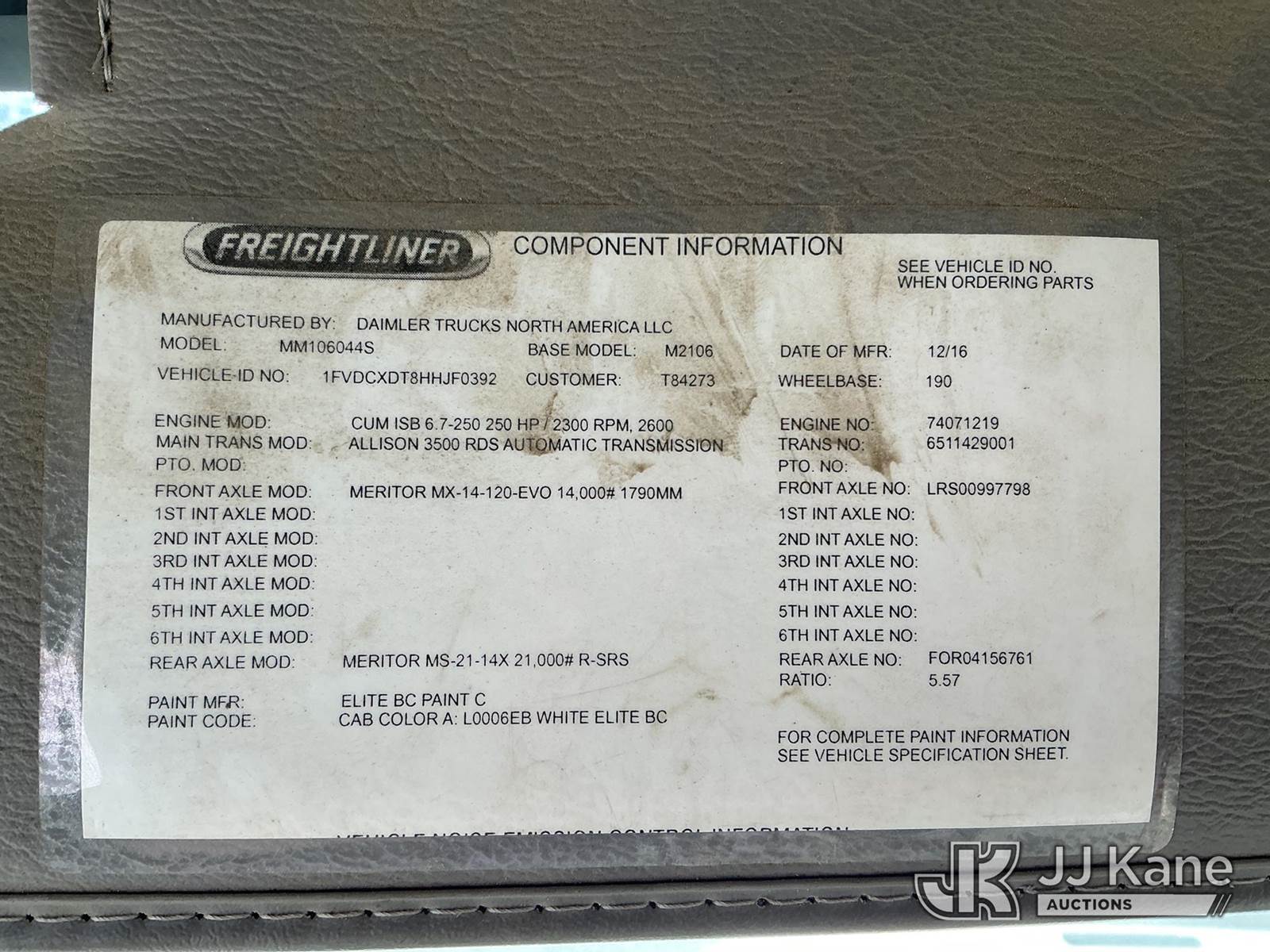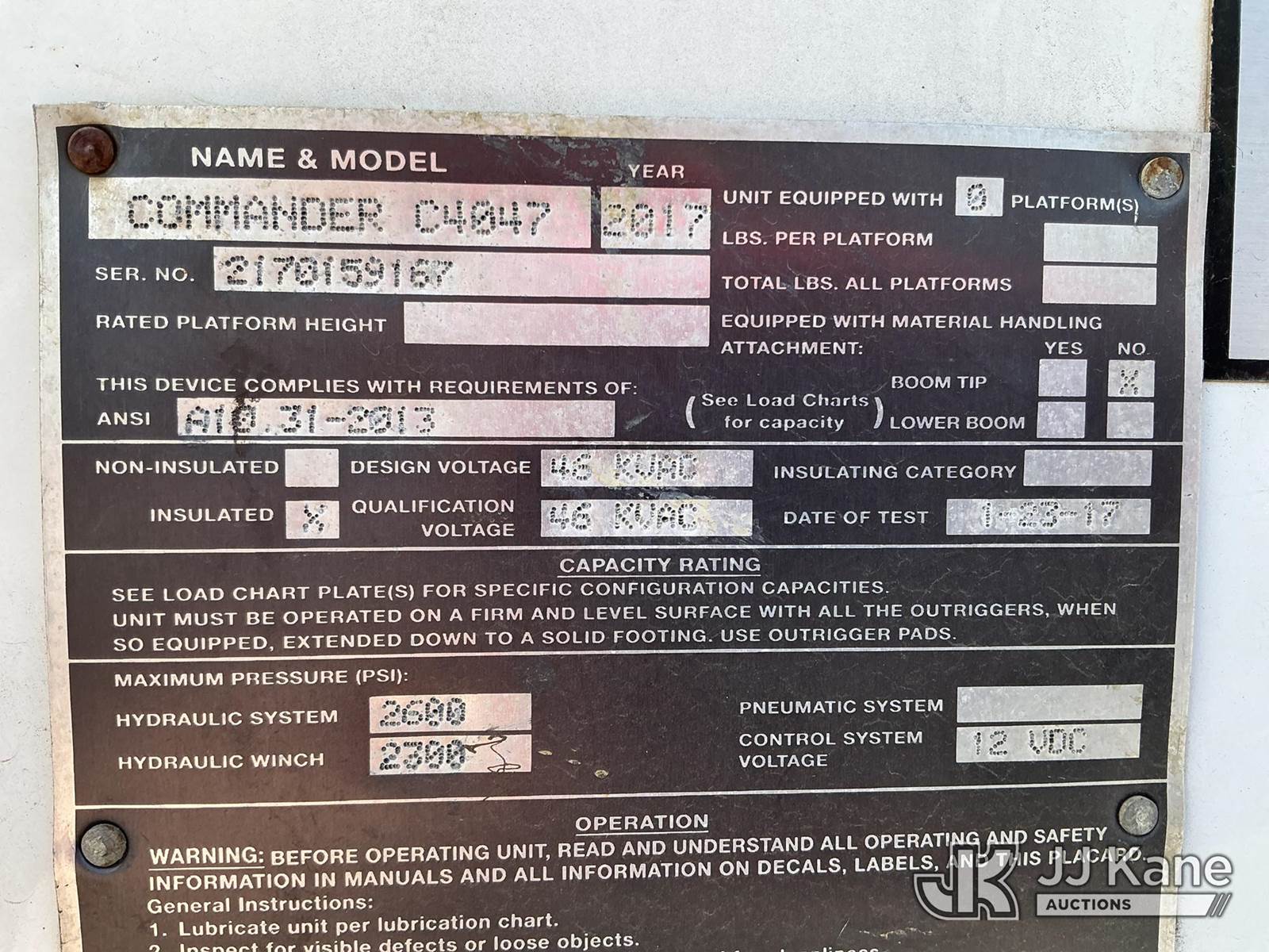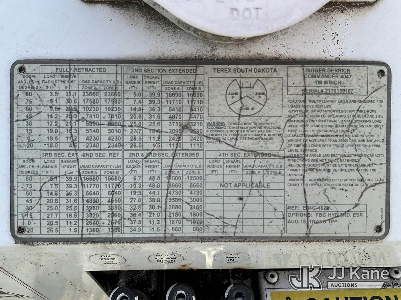 Terex Commander C4047, Digger Derrick s/n 2170159167, with 47 ft. sheave height, 3 section hyd boom, 2 spd digger, heel winch, pole grabs, riding console & 4 hyd outriggers, rear mounted on 2017 Freightliner M2 106 4X4 Utility Truck, Cummins ISB-250 6.7L diesel, Auto, A/C, with front winch , (114,858 miles) (Runs, Moves & Upper Operates ) This is a Titled Item NOTE: This unit is being sold AS IS/WHERE IS via Timed Auction and is located in China Grove, NC. Inspection & preview days for this unit are the 2 business days prior to the first day of items closing for this auction, item is located at 820 E NC Hwy 152 China Grove, NC 28023 and hours of operations are 8a-4p. For pre-sale questions, please contact Office Staff @ (704) 674-1113. (Manuals provided in cab) (Buyer is responsible for removal. Assistance by consignor or JJ Kane Auctions is not assured.)