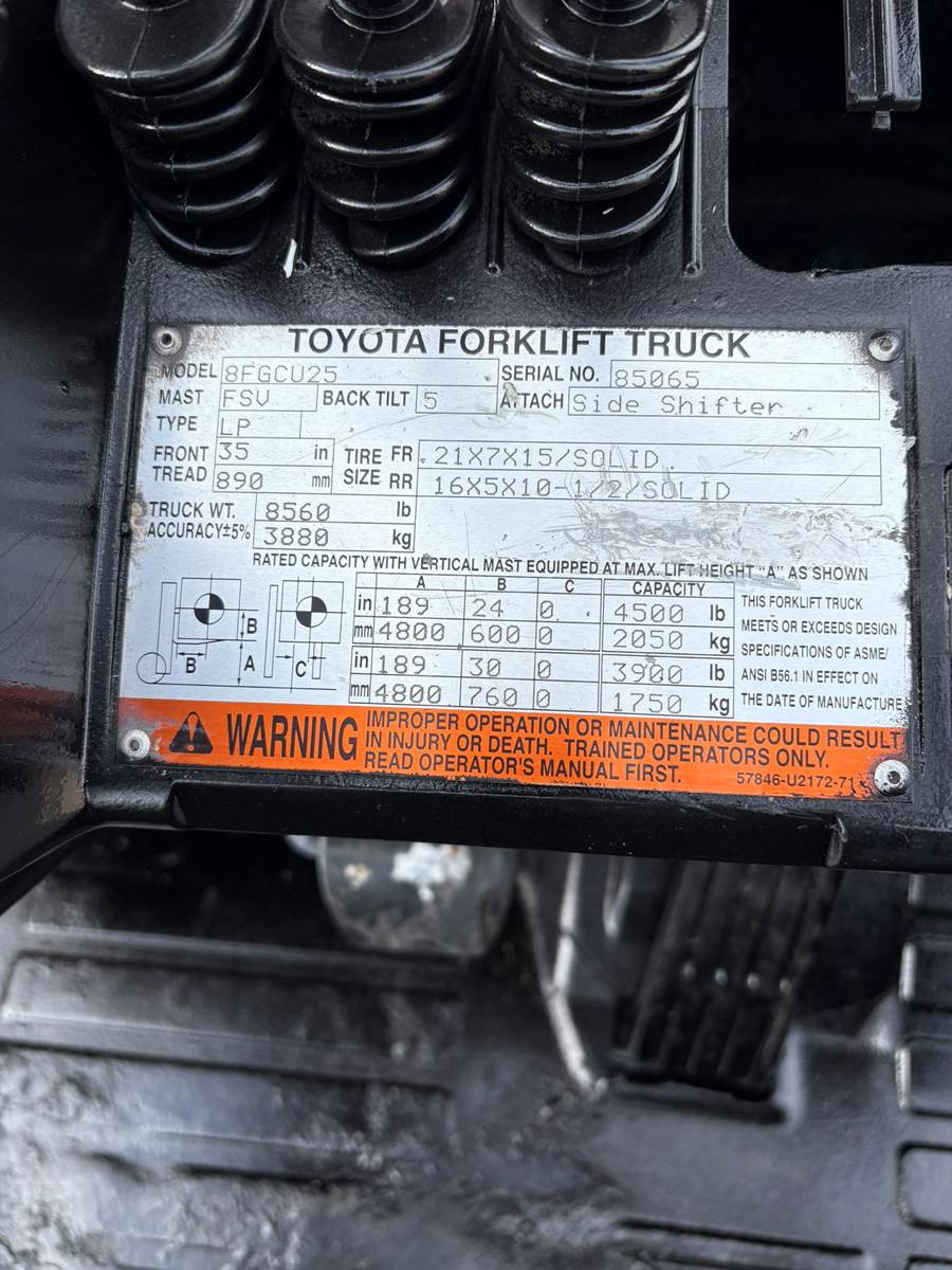 YEAR: 2017, MAKE: TOYOTA, MODEL: 8FGCU25, S/N: 83701, CAPACITY: 5000, HOURS: 5200, CUSHION TIRES, LIFT HEIGHT: 218", 42" CLASS II...