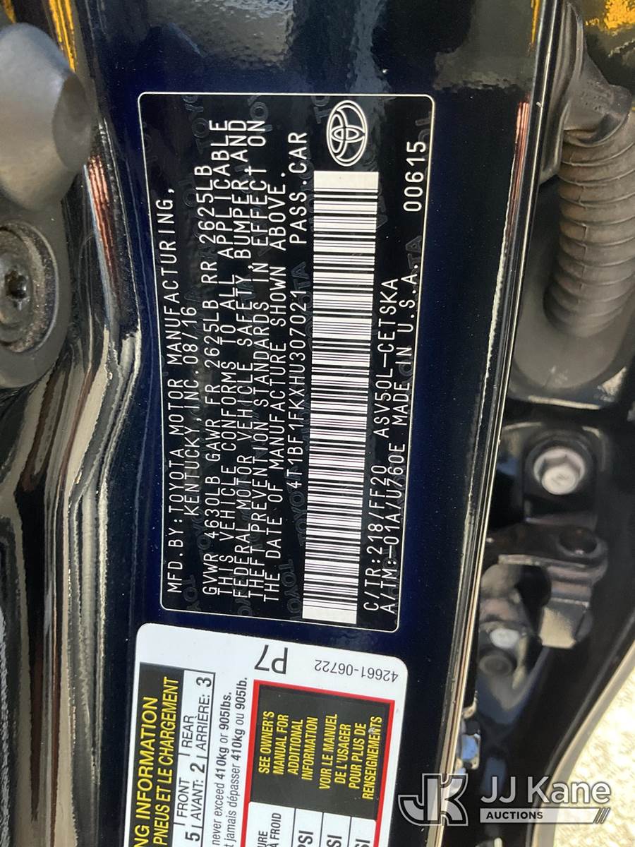 2017 Toyota Camry 4-Door Sedan, 4-cyl gas, 6-Speed Automatic, A/C, (126,986 miles) (Runs & Moves) This is a Titled Item NOTE: This unit is being sold AS IS/WHERE IS via Timed Auction and is located in Las Vegas, NV. Inspection & preview days for this unit are the 2 business days prior to the first day of items closing for this auction, item is located at 14655 Grand Valley Pkwy Las Vegas, NV 89165 and hours of operations are 8a-4p. Titles executed exactly as bidder registered. Ensure your name and/or business name and address in JJ Kane and/or ProxiBid is correct before bidding. For pre-sale questions, please contact Office Staff @ (801) 519-0123 and provide sale date and lot number. Las Vegas Dealer License Number DLR000053086 / OHV000053094. (Buyer is responsible for removal. Assistance by consignor or JJ Kane Auctions is not assured.)