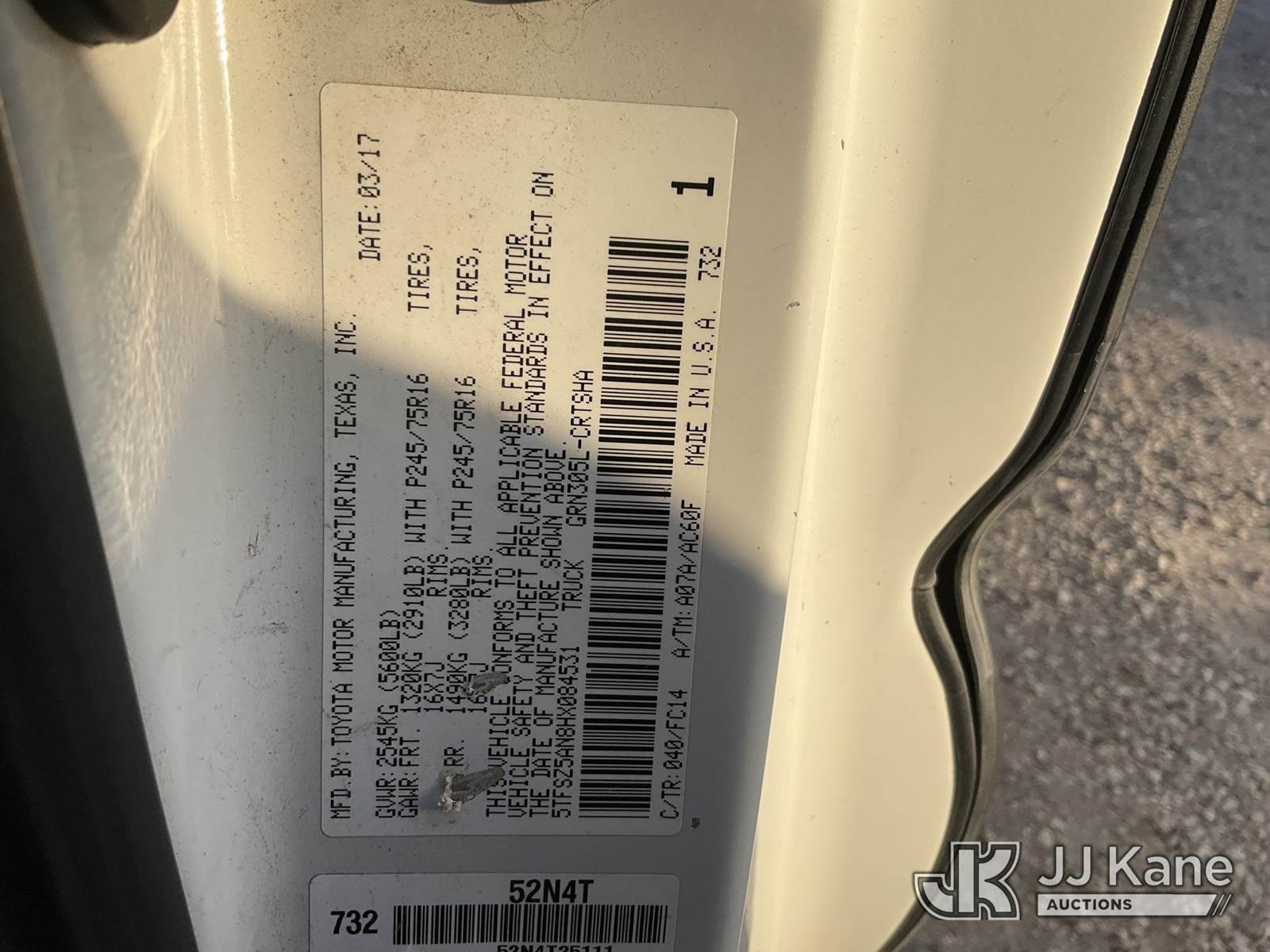2017 Toyota Tacoma Extended-Cab Pickup Truck, s/n 5TFSZ5AN8HX084531, 3.5L V6 DOHC 24V Gas, 4WD, 6-Speed Automatic, A/C, True Mileage Unknown (Not Running, Condition Unknown) (Per Seller Drive Shaft Damage, Front End Damage, Missing Battery Must Be Towed) This is a Titled Item NOTE: This unit is being sold AS IS/WHERE IS via Timed Auction and is located in Jurupa Valley, CA. Inspection & preview days for this unit are the 2 business days prior to the first day of items closing for this auction, item is located at 4510 Muth Way Jurupa Valley, CA 92509 and hours of operations are 8a-4p. For pre-sale questions, please contact please contact Office Staff @ (310) 353-7140. Dealer License Number 45696. (Buyer is responsible for removal. Assistance by consignor or JJ Kane Auctions is not assured.)