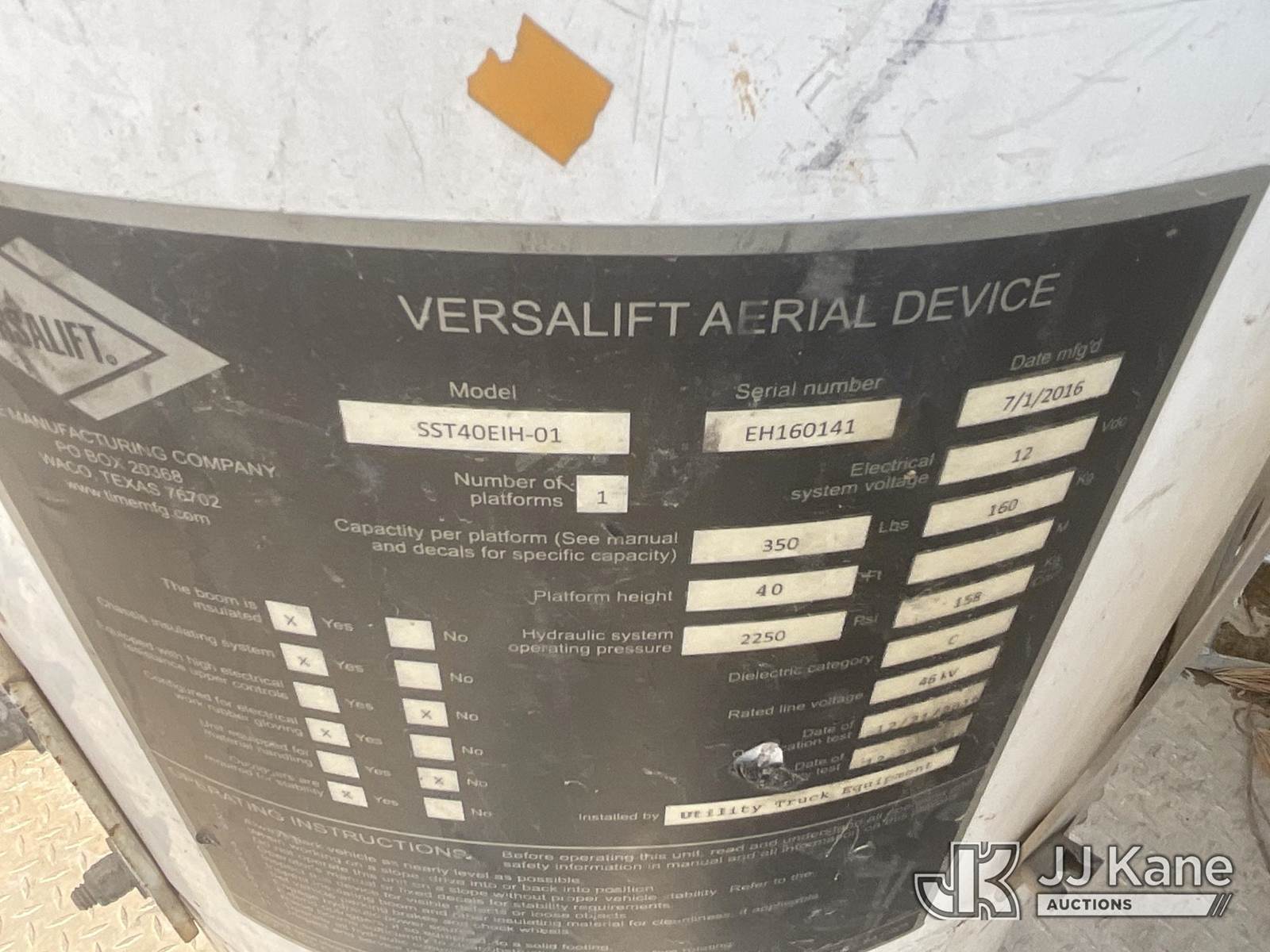 Versalift SST40EIH-01, 45 ft, Articulating & Telescopic Bucket Truck s/n EH160141, with single-man bucket & 2 hyd outriggers, rear mounted on 2017 Ford F-550 SuperCab DRW 4WD Extended-Cab Service Truck, 6.8L V10 SOHC 30V GAS, Auto, A/C, with Front winch, (197,395 miles) Electric Cooperative Owned Unit (Runs, Moves & Upper Operates per video) This is a Titled Item NOTE: This unit is being sold AS IS/WHERE IS via Timed Auction and is located in Utica, OH. Call Ken at (419) 295-5233 with questions. (Manuals provided in cab) (Buyer is responsible for removal. Assistance by consignor or JJ Kane Auctions is not assured.)