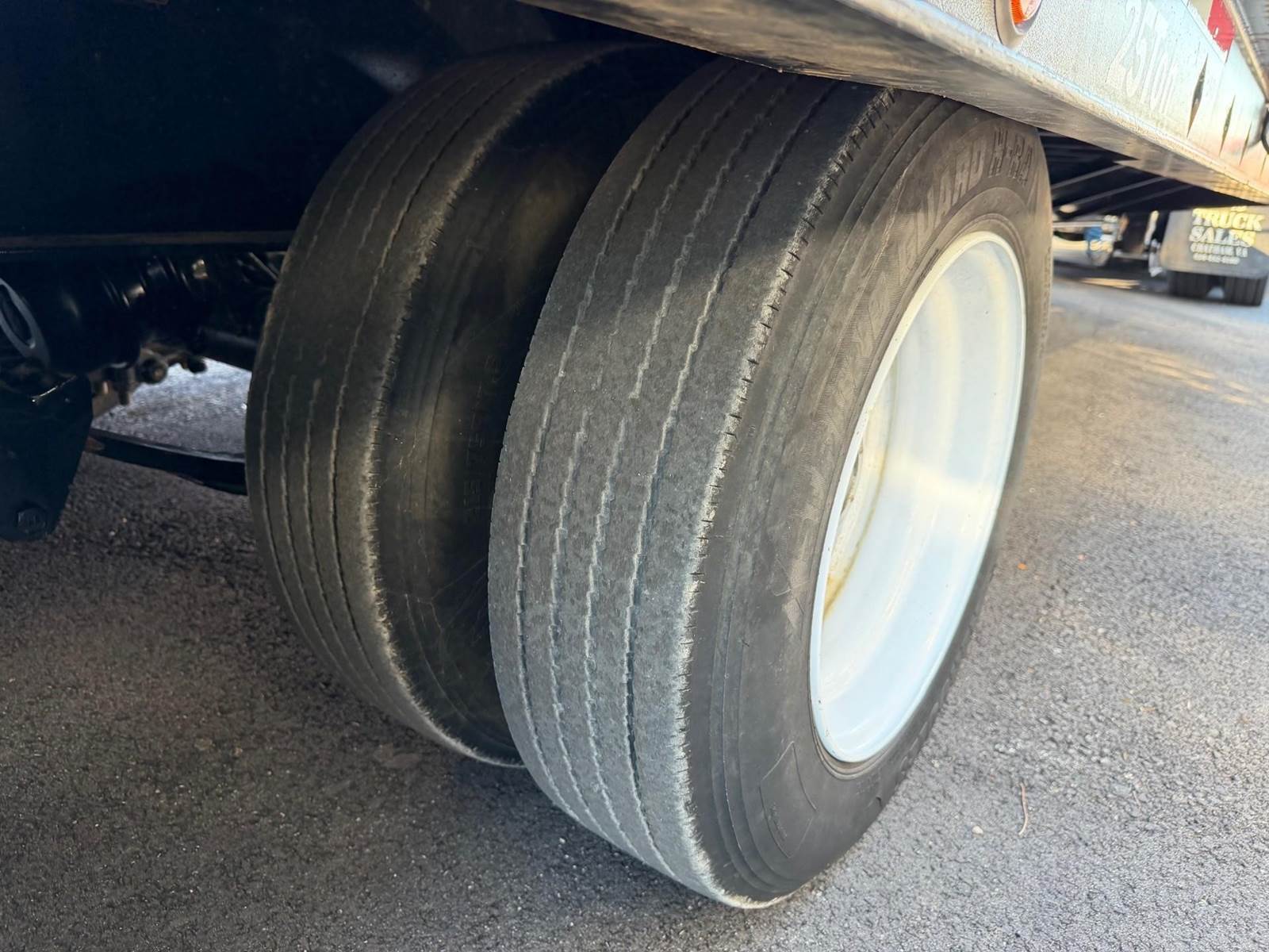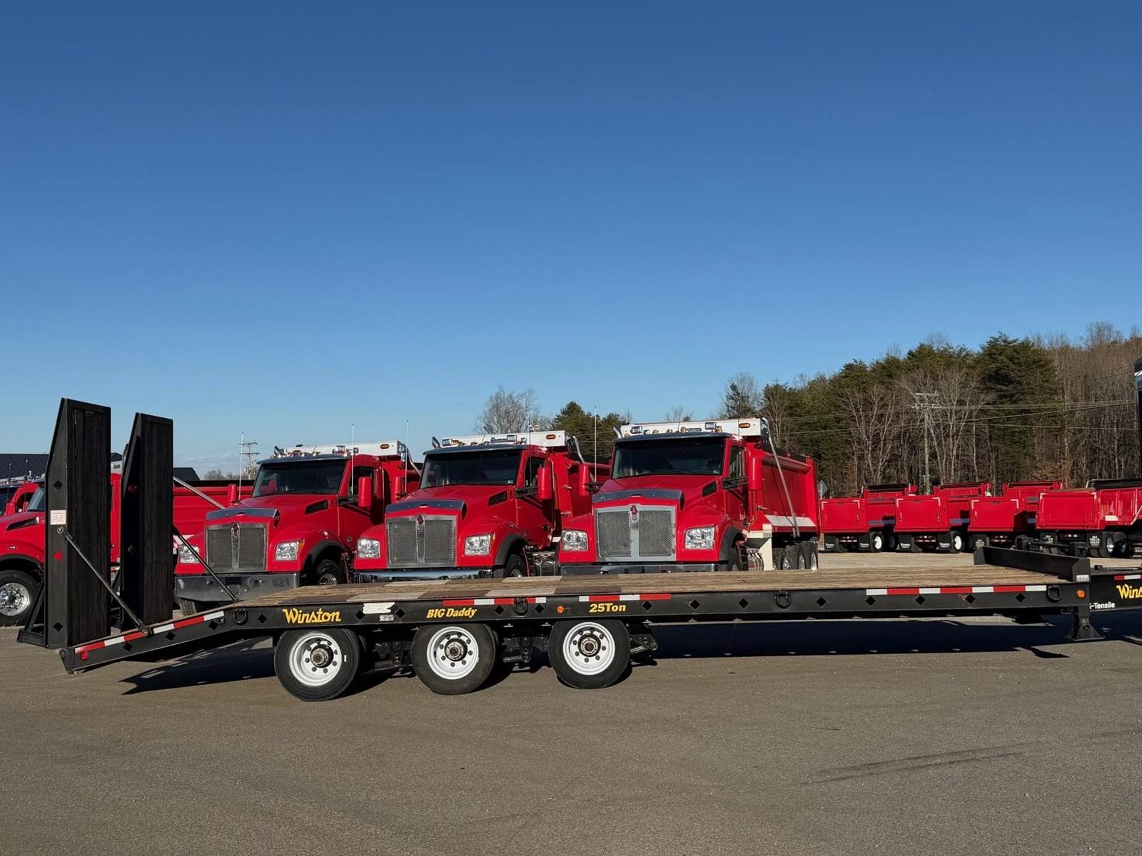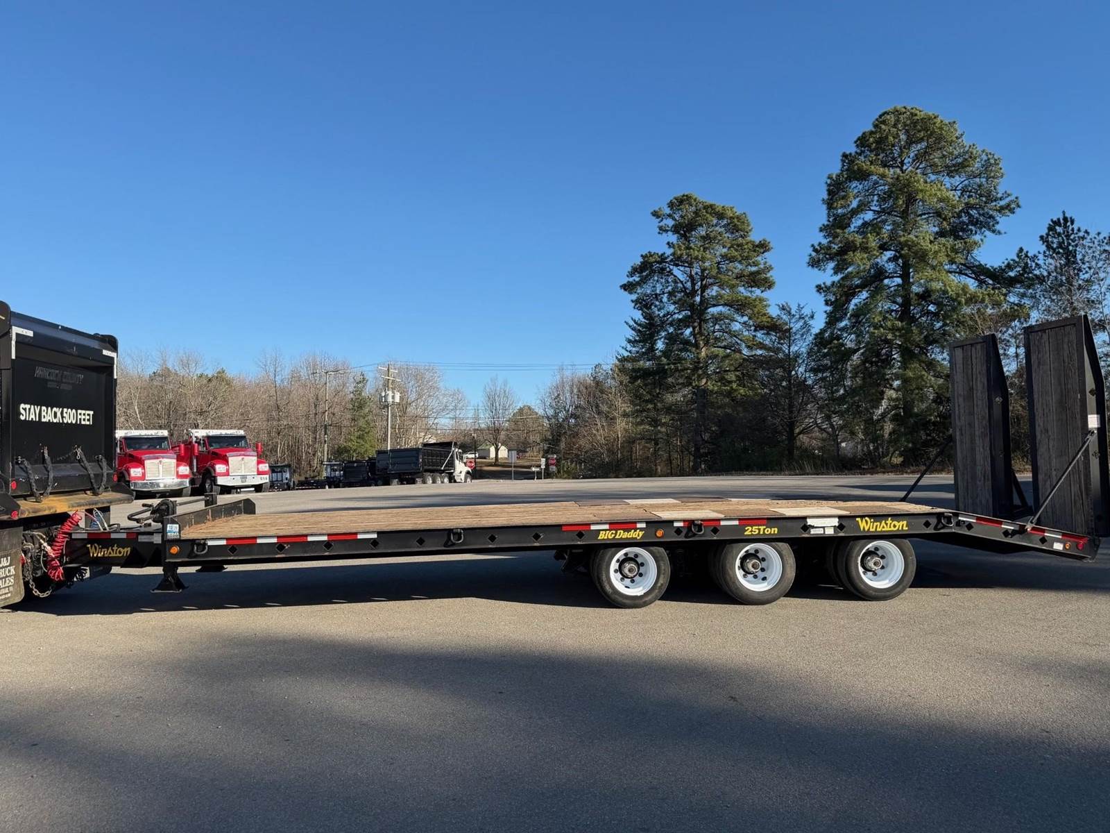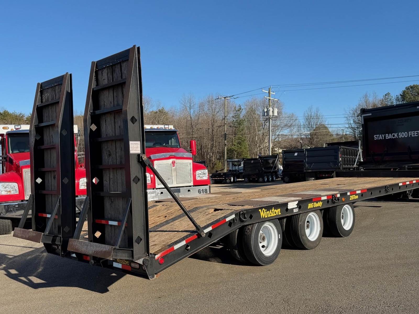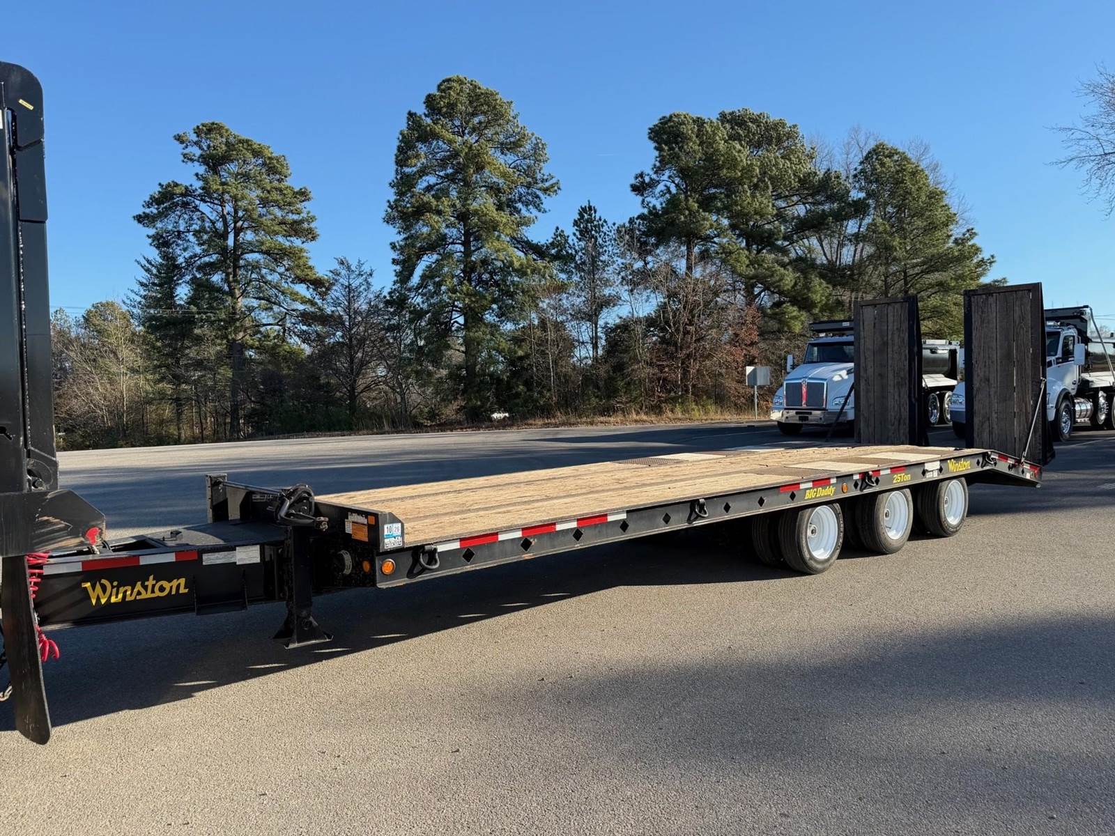 Triaxle, 25 Ton Tag-A-Long, 25' Deck, 5' Beaver Tail, 7'6" Hydraulic Ramps, 102" Wide, 18,160 GAWR Each, 61,450 GVWR, Spring Suspension, Dual Speed Landing Gear, 215/75R17.5 Tires on Steel Wheels