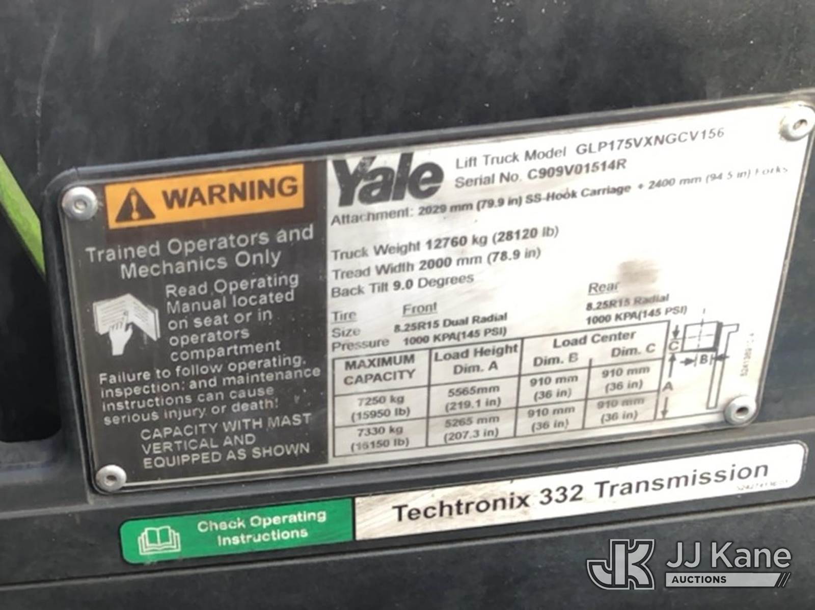 2017 Yale GLP175 Solid Tired Forklift, s/n C909V01514R, Shuttle, LPG, with 15,950 lb. capacity, 219 in. mast height, LPG Tanks Not Included. (Runs, Moves, Needs New Chain For Mast.) NOTE: This unit is being sold AS IS/WHERE IS via Timed Auction and is located in Ocala, FL. For more information & removal arrangements please contact Kevin Smith @ 816-244-1706. (Buyer is responsible for removal. Assistance by consignor or JJ Kane Auctioneers is not assured.)