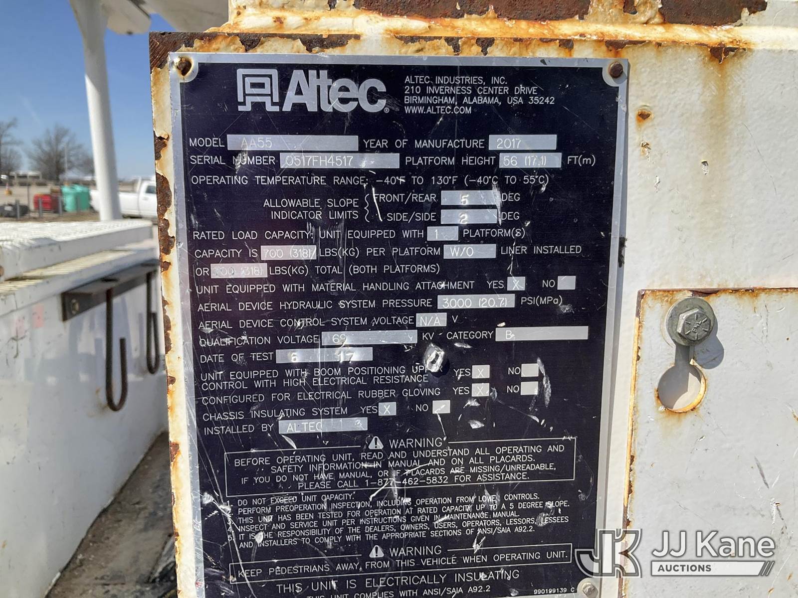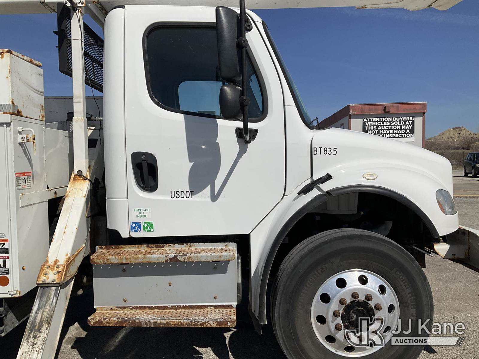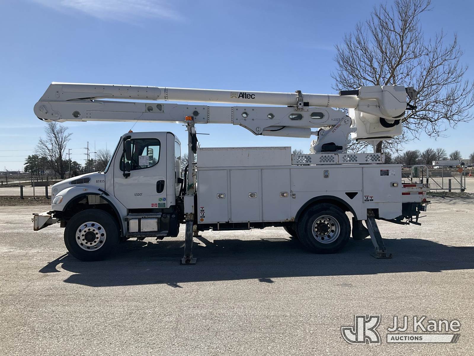 Altec AA55, 61 ft, Material Handling Bucket s/n 0517FH4517, with Four Outriggers, rear mounted on 2018 Freightliner M2 Utility Truck, Cummins 6.7L diesel, 4x4, Auto, A/C, (77,966 miles) (**Dealer Only** Runs & Moves)(Seller States **Do Not Operate**; this item has been removed from service due to the listed safety repairs that were not completed. The safety items below must be completed by an approved OEM facility before the unit can return to service: Broken Rotation Bearing Bolts, Upper Boom Stow Rest Pivot Pin Missing, Upper Controls Start/Stop Inoperable; Requires ANSI Inspection for Repair/Replacement Requirements.) (Reads 7,079 hours) (Bidding Restricted to Licensed Vehicle Dealers Only), This is a Titled Item NOTE: This unit is being sold AS IS/WHERE IS via Timed Auction and is located in Kansas City, MO. Inspection & preview days for this unit are the 2 business days prior to the first day of items closing for this auction, item is located at 962 Tel Aviv Ave Kansas City, MO 64153 and hours of operations are 8a-4p. For pre-sale questions, please contact Ricky McPherson @ (816) 610-2250. (Manuals provided in cab) (Buyer is responsible for removal. Assistance by consignor or JJ Kane Auctions is not assured.)