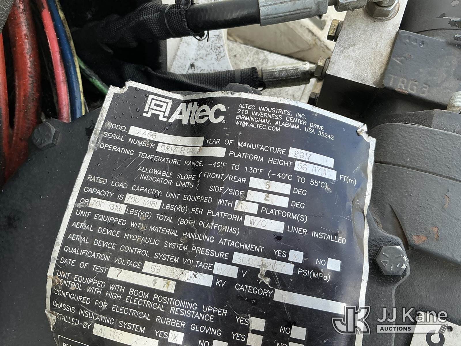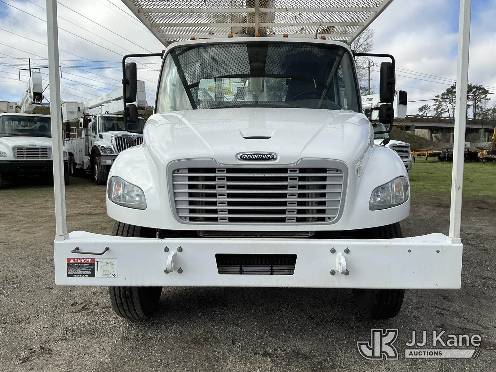 Altec AA55-MH, 60 ft, Material Handling Bucket Truck s/n 0617FH4676, with two man bucket and four hydraulic outriggers, rear mounted on 2018 Freightliner M2 106 Utility Truck, Cummins 6.7L diesel, 6-spd, A/C, (74,348 miles) (Runs, Moves, Upper Operates) (Jump to Start, Hydraulic Leak, Upper Unit Serial Plate Missing) This is a Titled Item NOTE: This unit is being sold AS IS/WHERE IS via Timed Auction and is located in Florence, SC. Inspection & preview days for this unit are by appointment only; please contact us at contact@jjkane.com or 84-Go-JJKane for more details. (Manuals provided in cab) (Buyer is responsible for removal. Assistance by consignor or JJ Kane Auctions is not assured.)