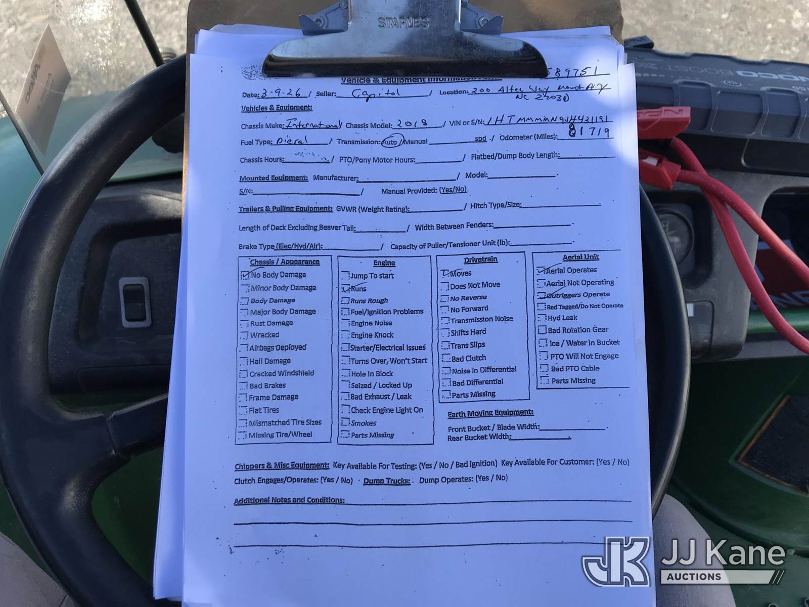 Altec AA55-MH, 60 ft, Material Handling Bucket Truck s/n 0617FH4689, with two man bucket, rear mounted on 2018 International 4300 Utility Truck, 6.7L diesel, 4X2, Auto, A/C, (81,719 miles) (Runs, Moves & Upper Operates) This is a Titled Item NOTE: This unit is being sold AS IS/WHERE IS via Timed Auction and is located in Mount Airy, NC. Inspection & preview days for this unit are by appointment only; please contact us at contact@jjkane.com or 84-Go-JJKane for more details. (Missing manuals, See Auction Company for Manufacturers Information to obtain manuals) (Buyer is responsible for removal. Assistance by consignor or JJ Kane Auctions is not assured.)